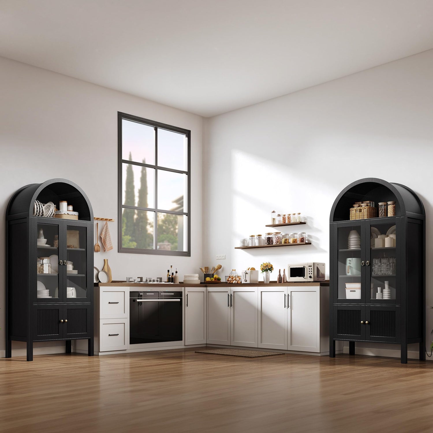 - Stylish Arched Design Cabinet - This arched pantry cabinet is simple and elegant, The elegant arched design brings a modern and graceful ambiance to the kitchen or living room. It not only helps with storage but also adds a touch of sophistication and precision, creating a refined and timeless aesthetic. add charm to your home.