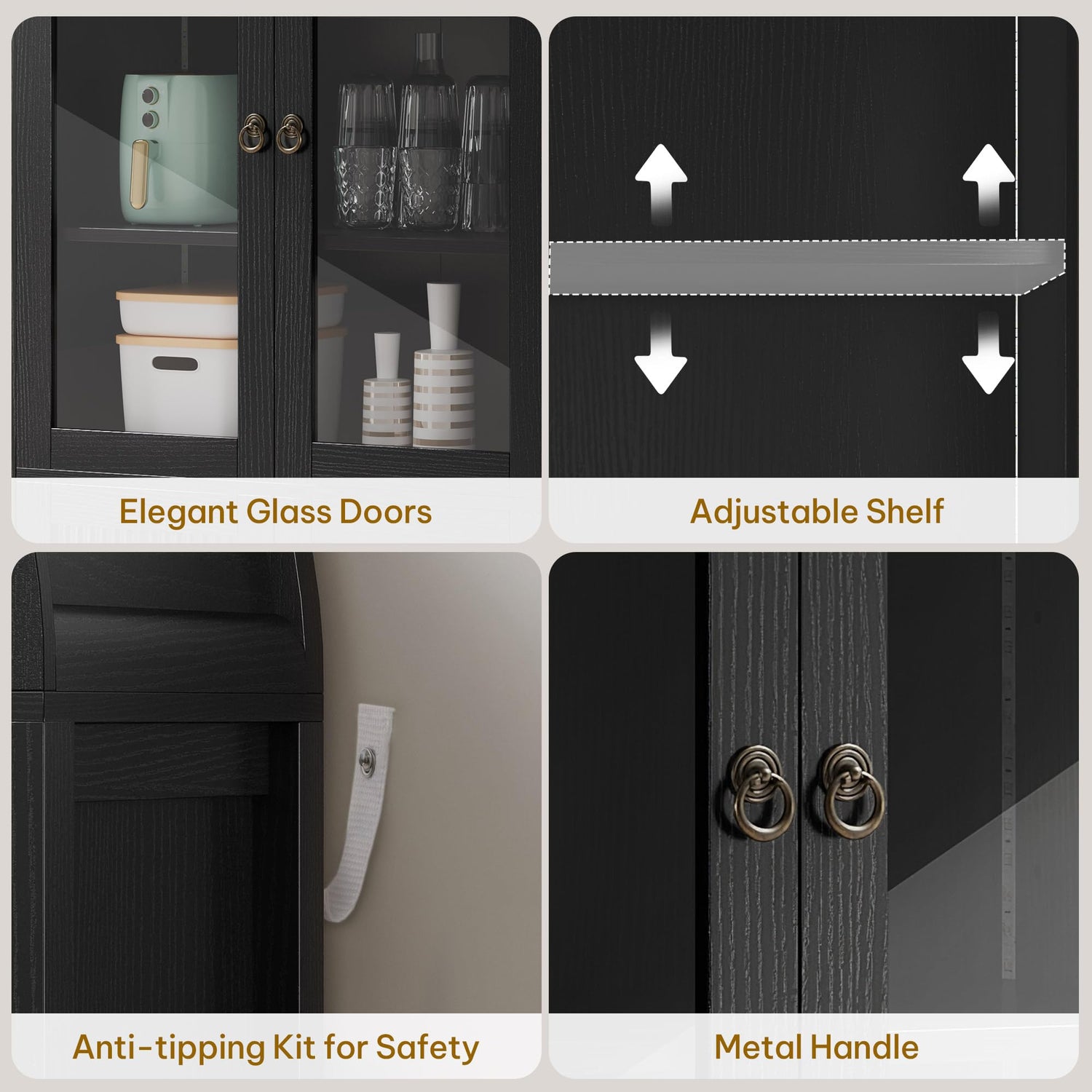 - Large Storage Space - The 71" H x 15.75" L x 30.9" W oversized tall arched cabinet with double tempered glass door storage and adjustable shelves and metal handles. each shelf can hold up to 45 lbs, it can serve as a Kitchen pantry cabinet in the kitchen, a storage cabinet in the living room, or a bookcase in the study. To accommodate items of various heights, we have provided adjustable shelves for you to place different objects, ensuring that your cabinet remains fully functional