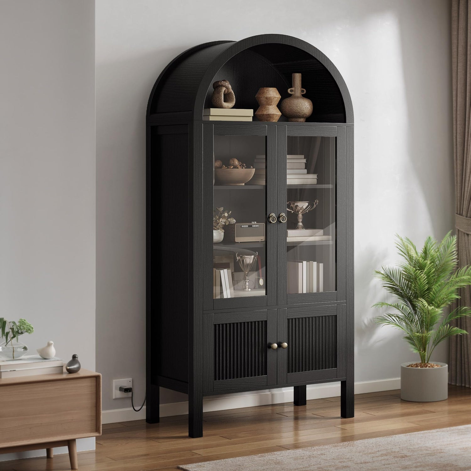 - Beautiful LED Lights - Brighten up your space with the LED lights(24 Colors) that wrap Inside the arched glass cabinet. Easily controlled via remote or app, you can set the mood for cozy reading or intimate conversations, with options for music syncing and timers.