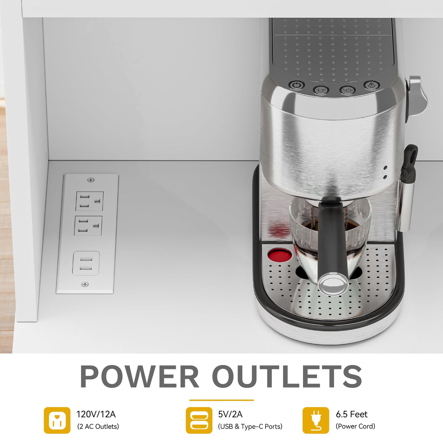 - Built-in Power Outlet: Enhance kitchen functionality with our buffet cabinet's built-in power outlet; It's suitable for powering small appliances like coffee makers, ice machines, and microwaves, making it a practical addition to your daily routine