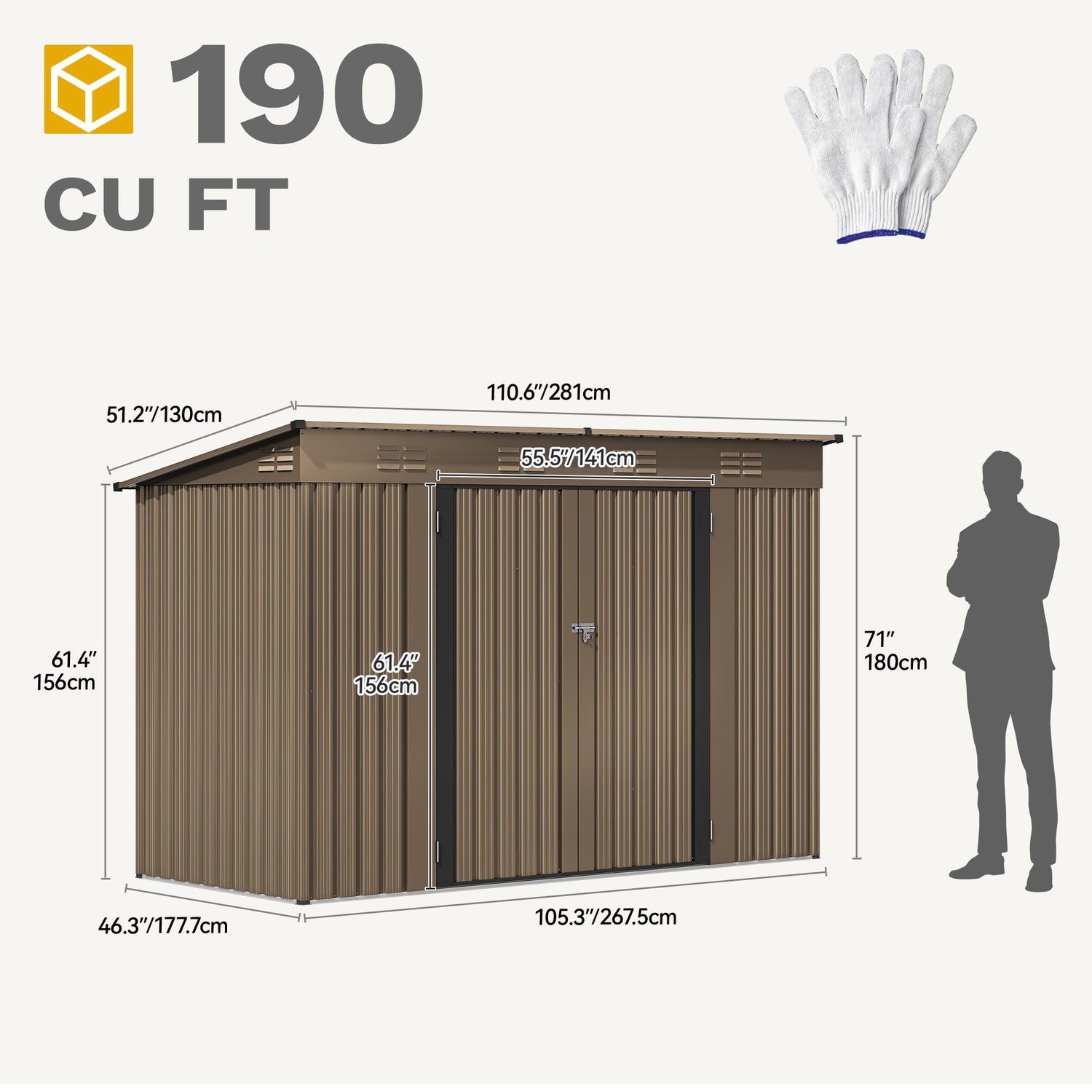 - Capacious Storage: With external measurements of 105.31''L*46.34''W*70.87''H and a door size of 55.83''L*61.42''W, this backyard storage shed offers abundant space for various items such as snow blowers, lawn mowers, outdoor furniture, bikes, BBQ grills, generators, garbage bins, and more.