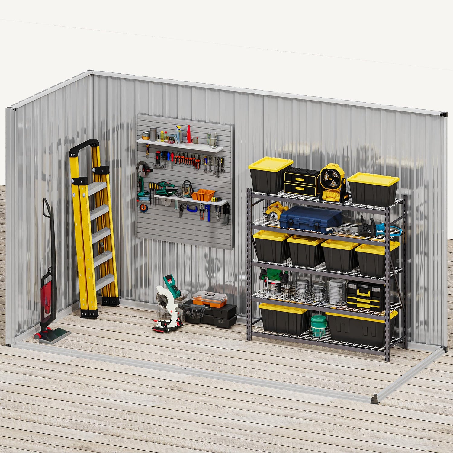 - All-Season Suitability: The garden shed is constructed with thickened galvanized steel and a resilient frame, and offers impressive rust protection. The design includes overlapping wall panels and a tilted roof to prevent rainwater accumulation, enabling year-round use.