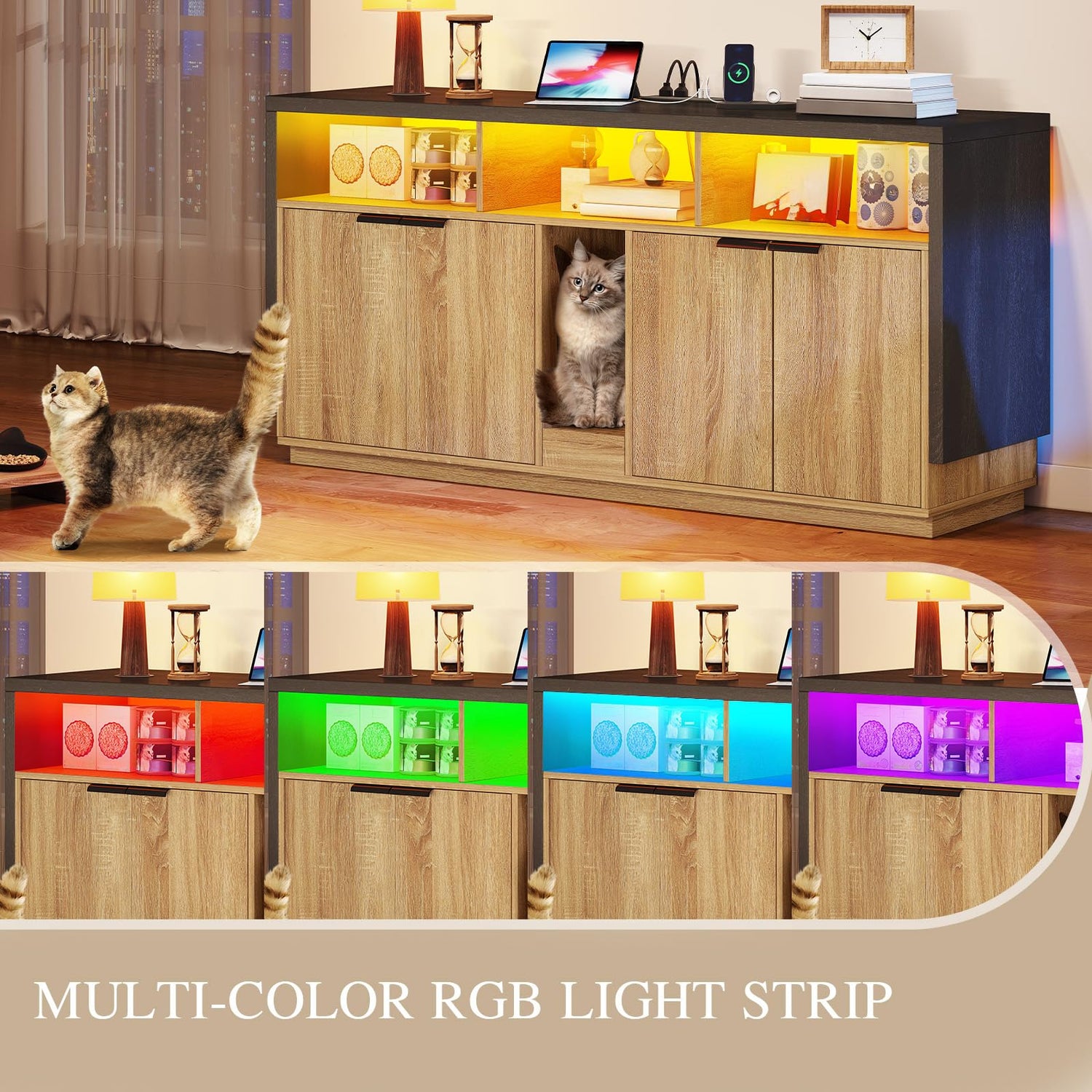 DWVO Cat Litter Box Enclosure for 2 Cats, Litter Box Furniture Hidden with Power Outlet & LED Light, Wooden Cat Cabinet TV Stand Furniture w Double Rooms for Indoor Cats, 59" L x15.7 W x27.5 H, Oak