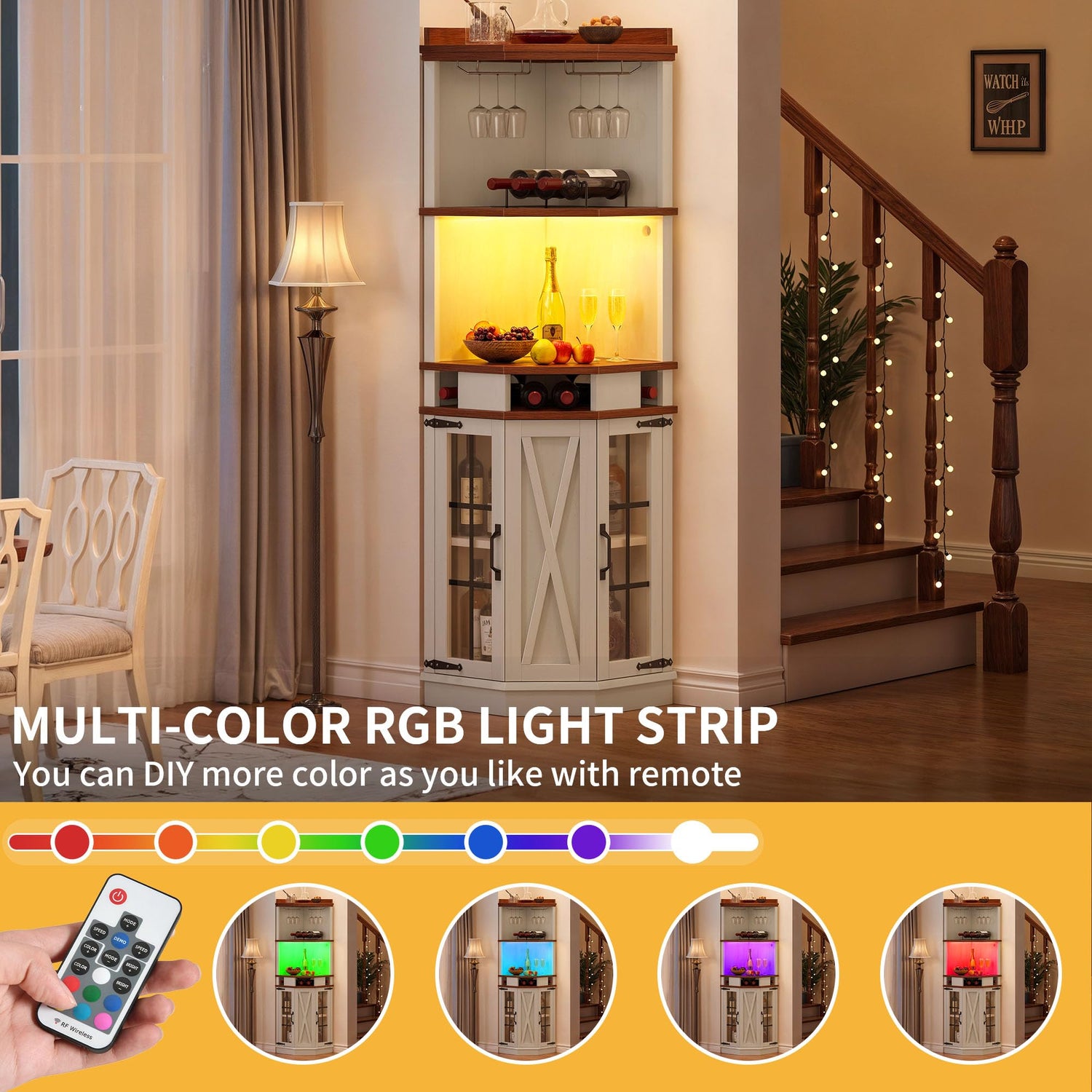 - LED Light Enhancement: Transform your space with integrated LED light with 17 color options and 4 dynamic modes, enhancing the ambiance for wine tastings, parties, or casual evenings. The corner cabinet is controllable via a convenient remote