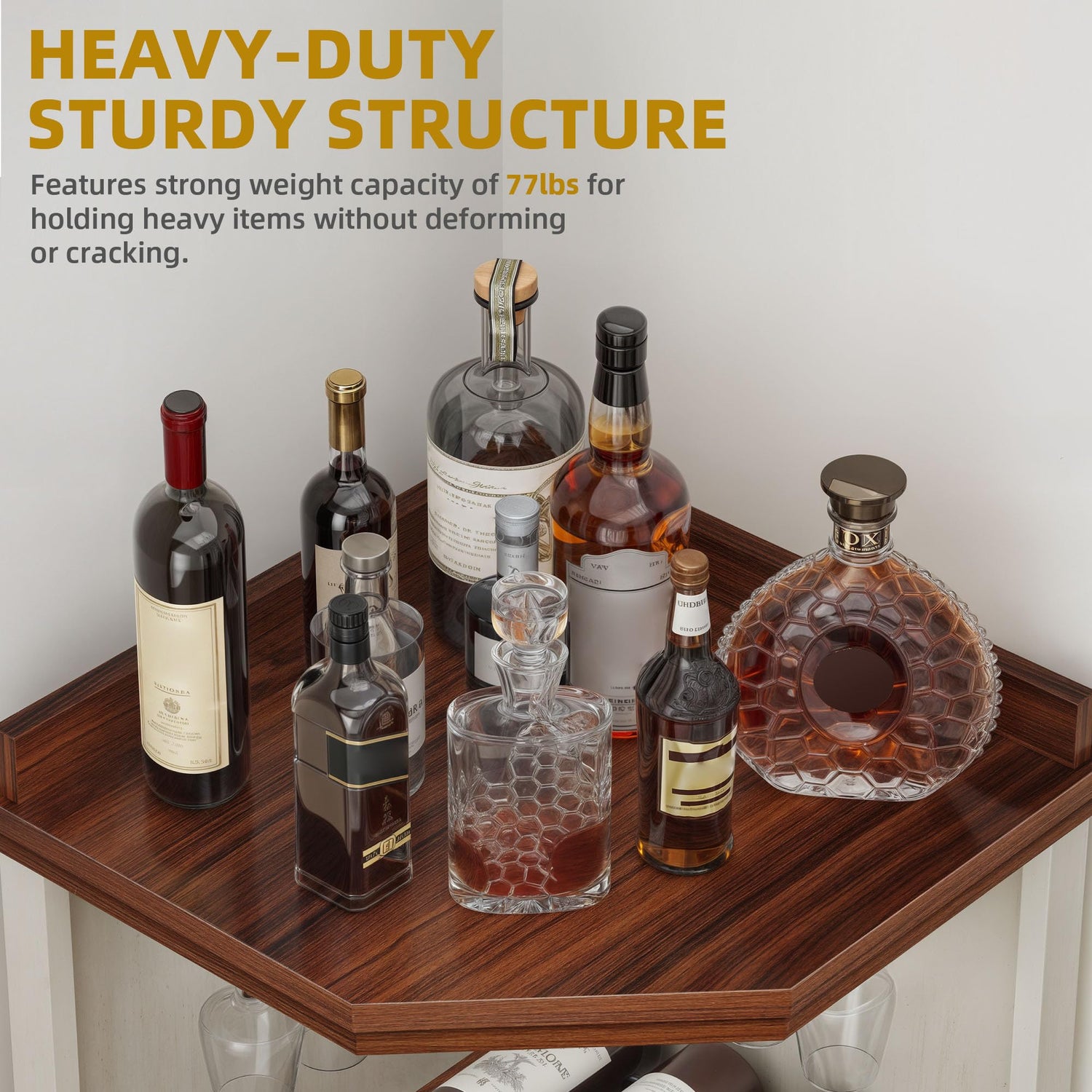 - Ample Storage: This corner bar cabinet features two lying wine racks, multiple compartments, bottle holders, and an adjustable shelf for flexible organization. Ideal for neatly arranging glasses, bottles, and bar essentials while maximizing space