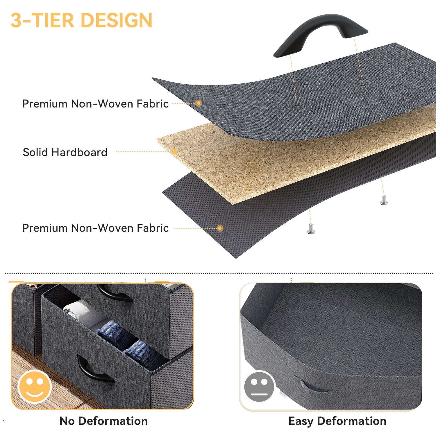- ROOMY FABRIC DRESSER- 8 deep foldable drawers are spacious enough to hold your clothes and daily necessities; Large wooden top is great for showcasing your lamps, clocks, glasses, photos, etc.