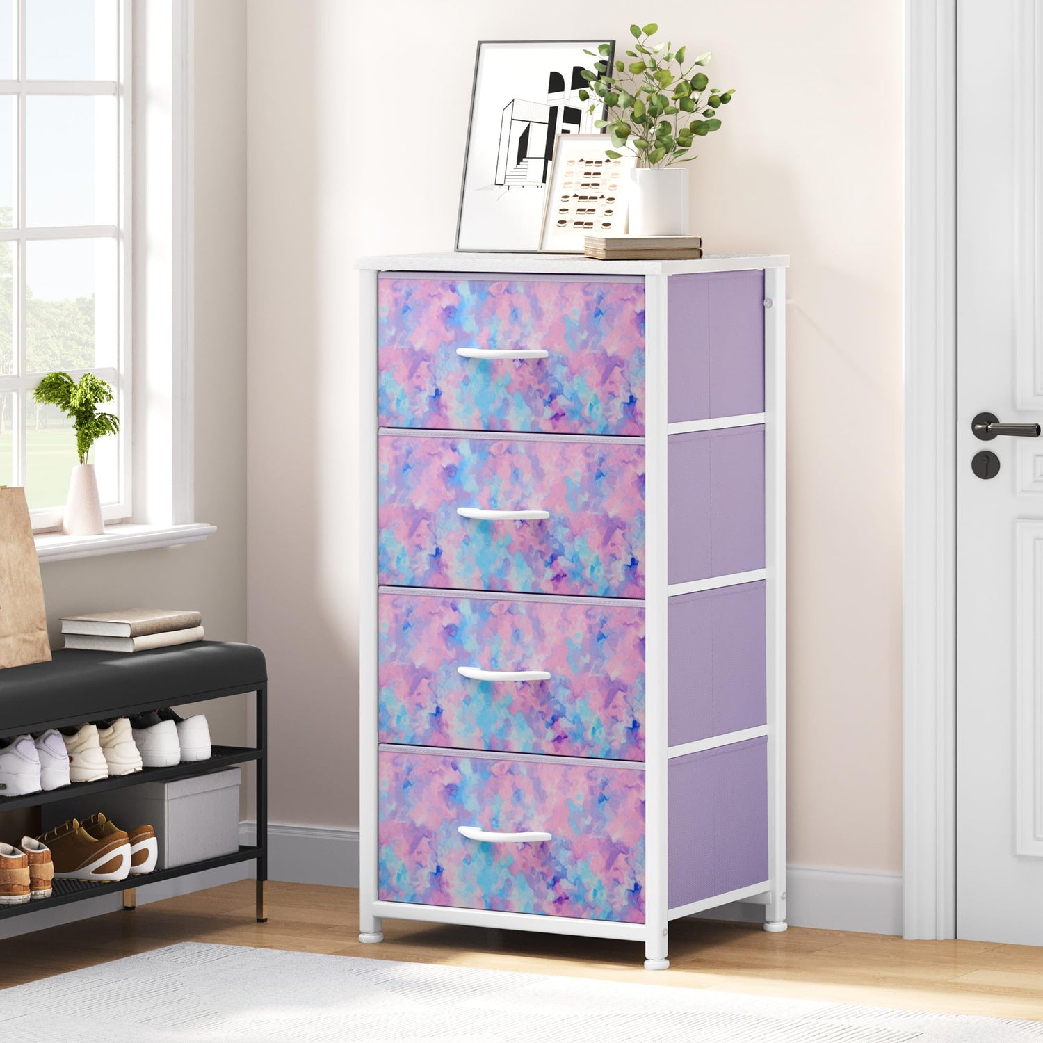 - 4 DRAWER CHEST- This chest of drawers features portability and a foldable design with easy-to-pull handles, allowing for quiet open & close; Folds flat for convenient storage and relocation