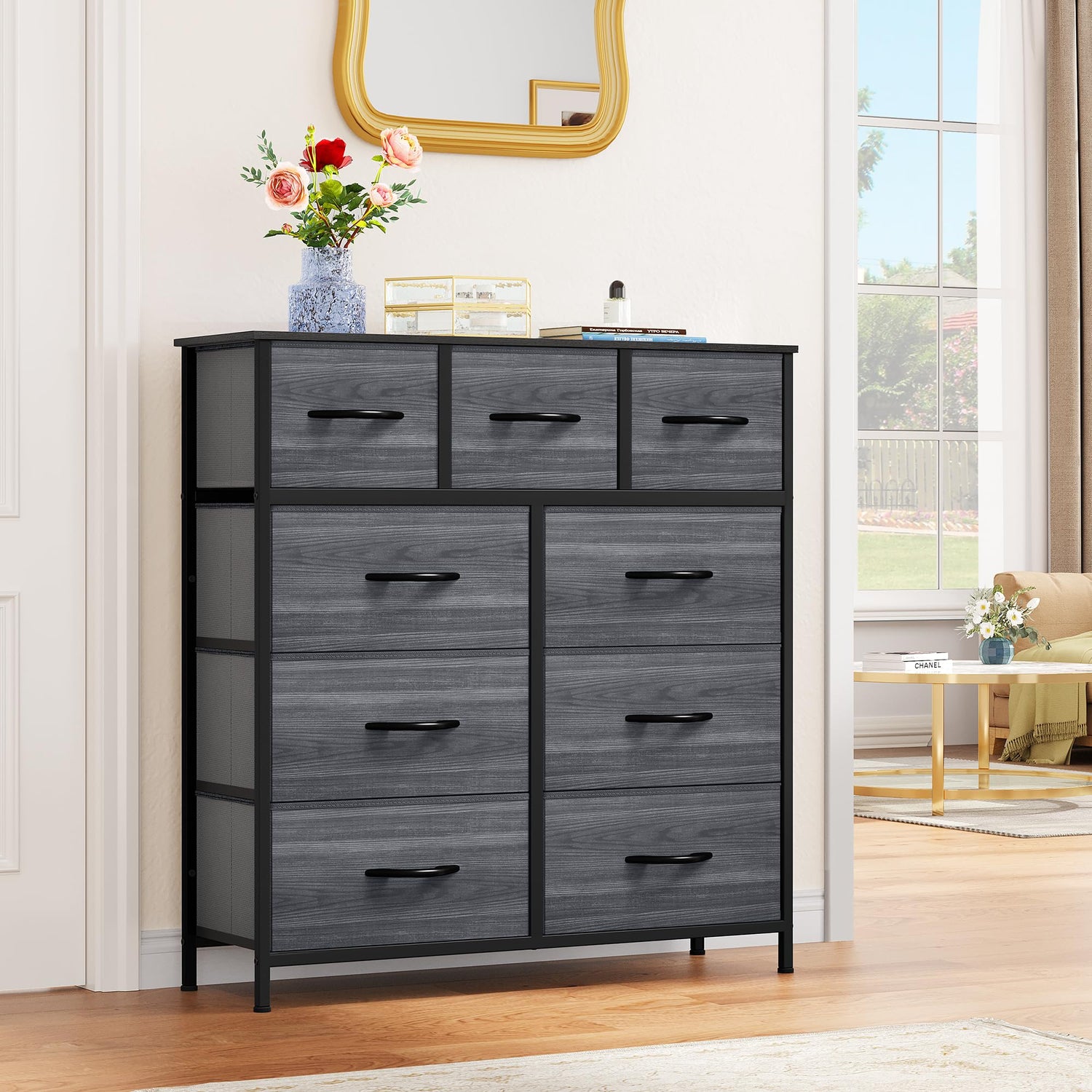 • QUALITY CONSTRUCTION- Structured with a powerful metal frame and a durable MDF wooden top; Contains 9 removable drawers with easy-to-pull wooden handles; Held up by 4 adjustable plastic legs that prevent scratches to your floor; The innovative crossbar design on the back enhances product stability; The dresser can be secured to a wall with screws