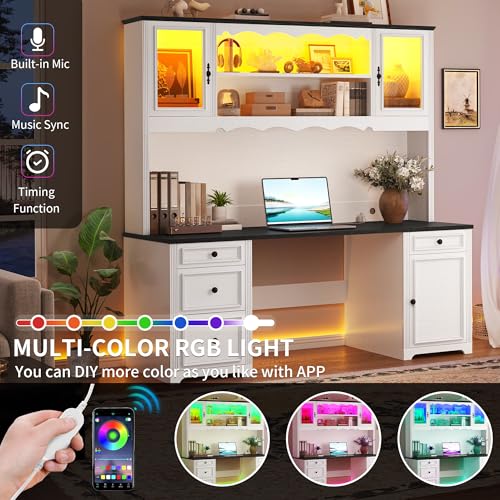 DWVO Executive Desk with Hutch and Power Outlets, Computer Desk with Drawers & LED Lights, Farmhouse Home Office Desks with Storage Shelves, White & Black