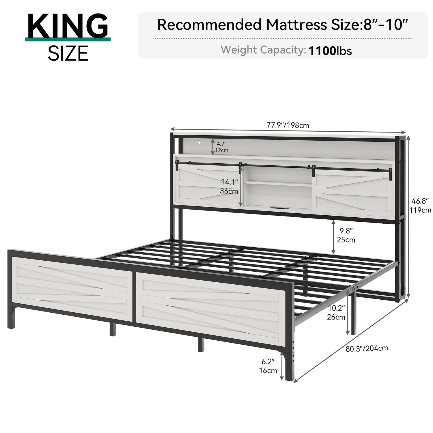 DWVO Farmhouse King Bed Frame with Headboard, Platform Bed with LED Lights and Charging Station, Sliding Barn Door, Solid Metal Slats, No Box Spring Needed (White)