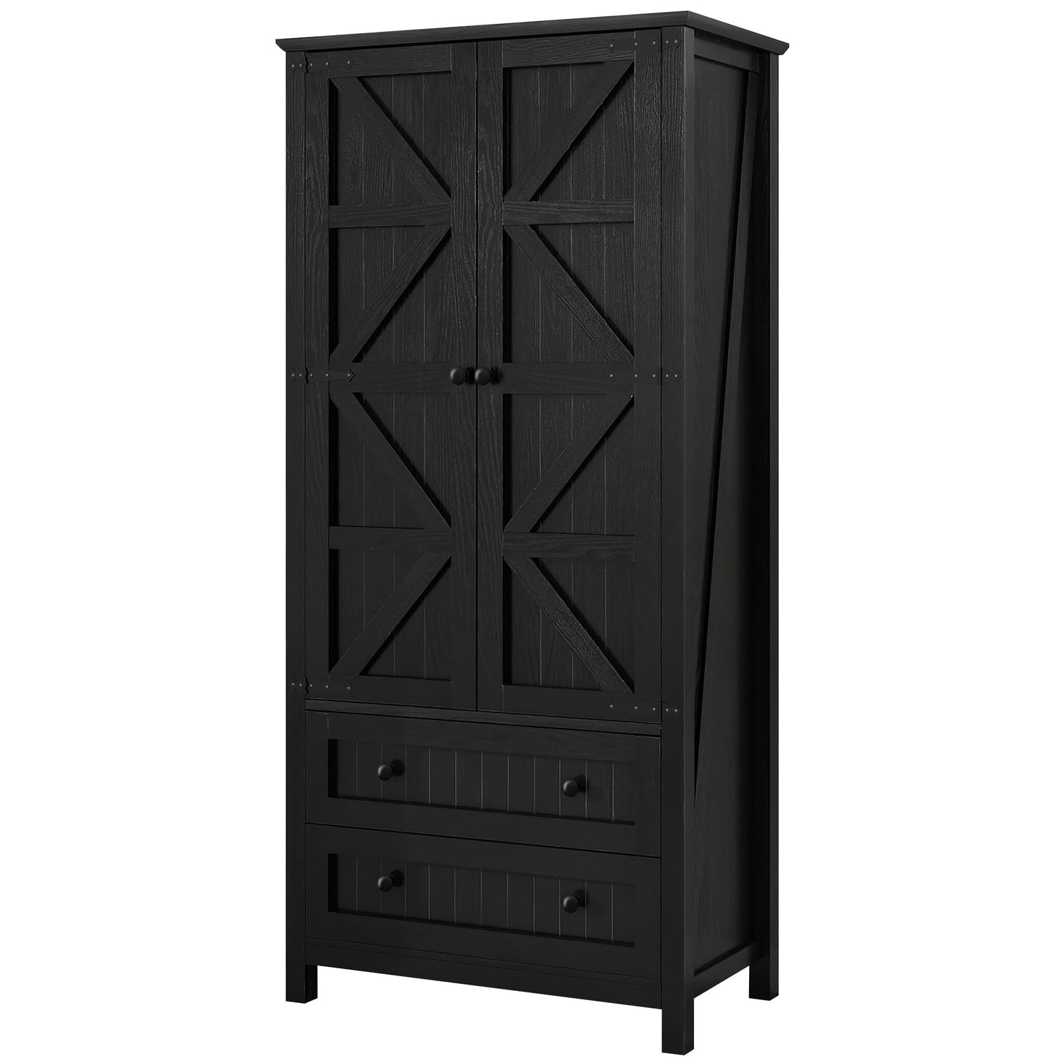- Charming Farmhouse Style: With an elegantly sleek finish and barn-door design accented by black metal, our tall pantry cabinet seamlessly combines modern rustic style with vintage farmhouse charm. Whether your home is contemporary or vintage-inspired, this kitchen pantry storage cabinet will complement your aesthetic preferences and highlight your impeccable taste