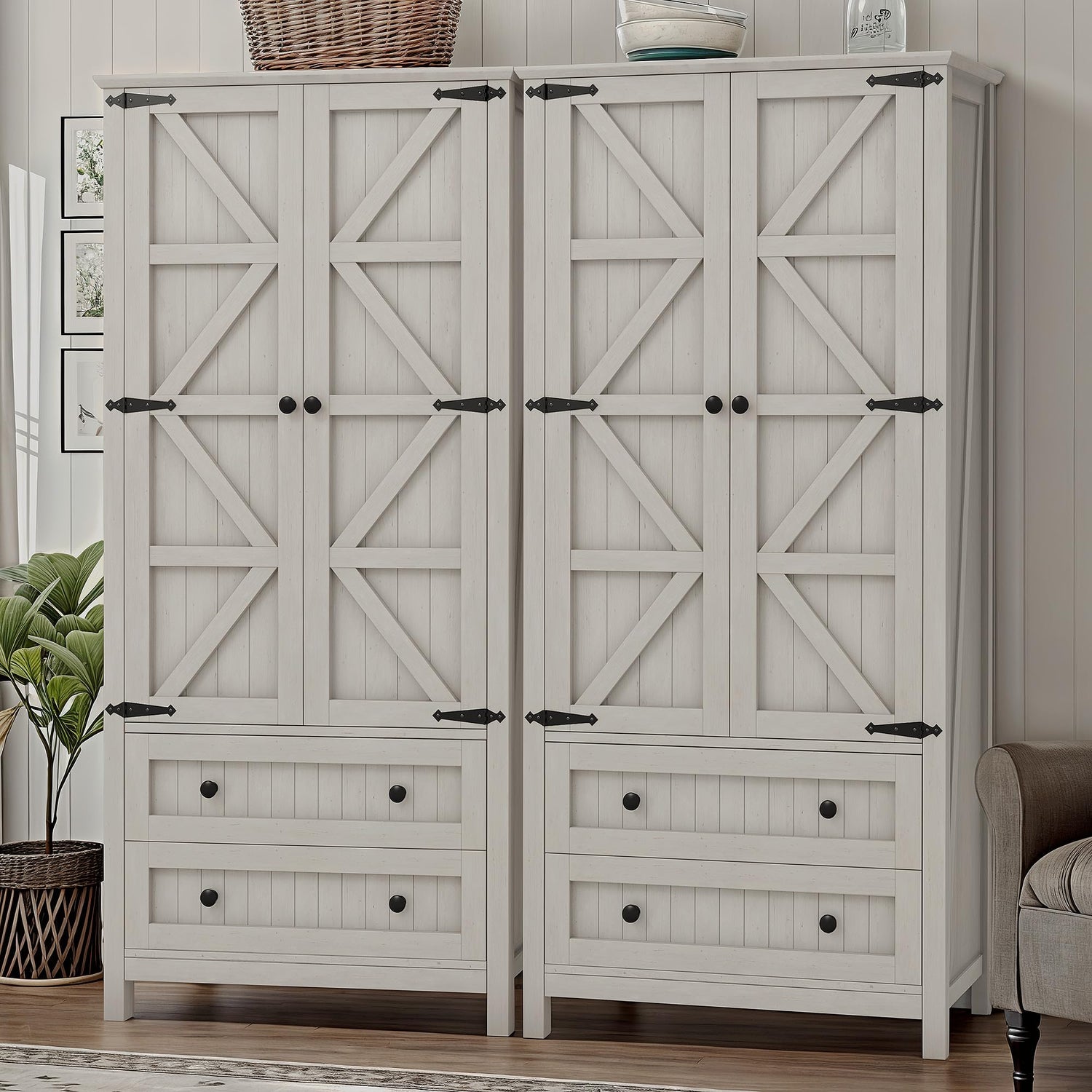 Details: With 3 shelves and 2 large drawers, this kitchen pantry cabinet provides spacious storage for dishes, pots and pans, canned foods and more. The 2 large lower drawers are perfect for organizing napkins, towels, and silverware.The 2 barn doors keep your belongings safe and dust-free while adding a touch of style to your space.