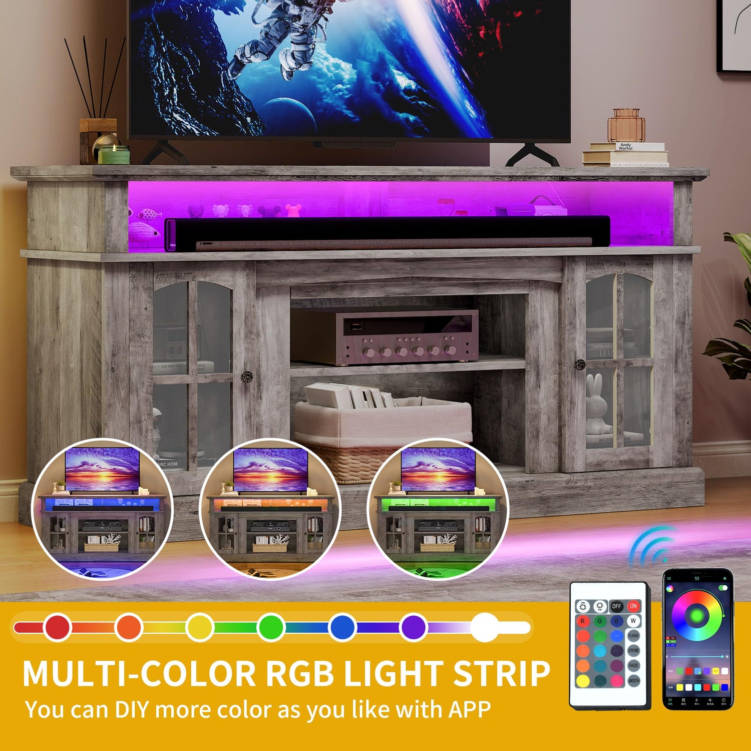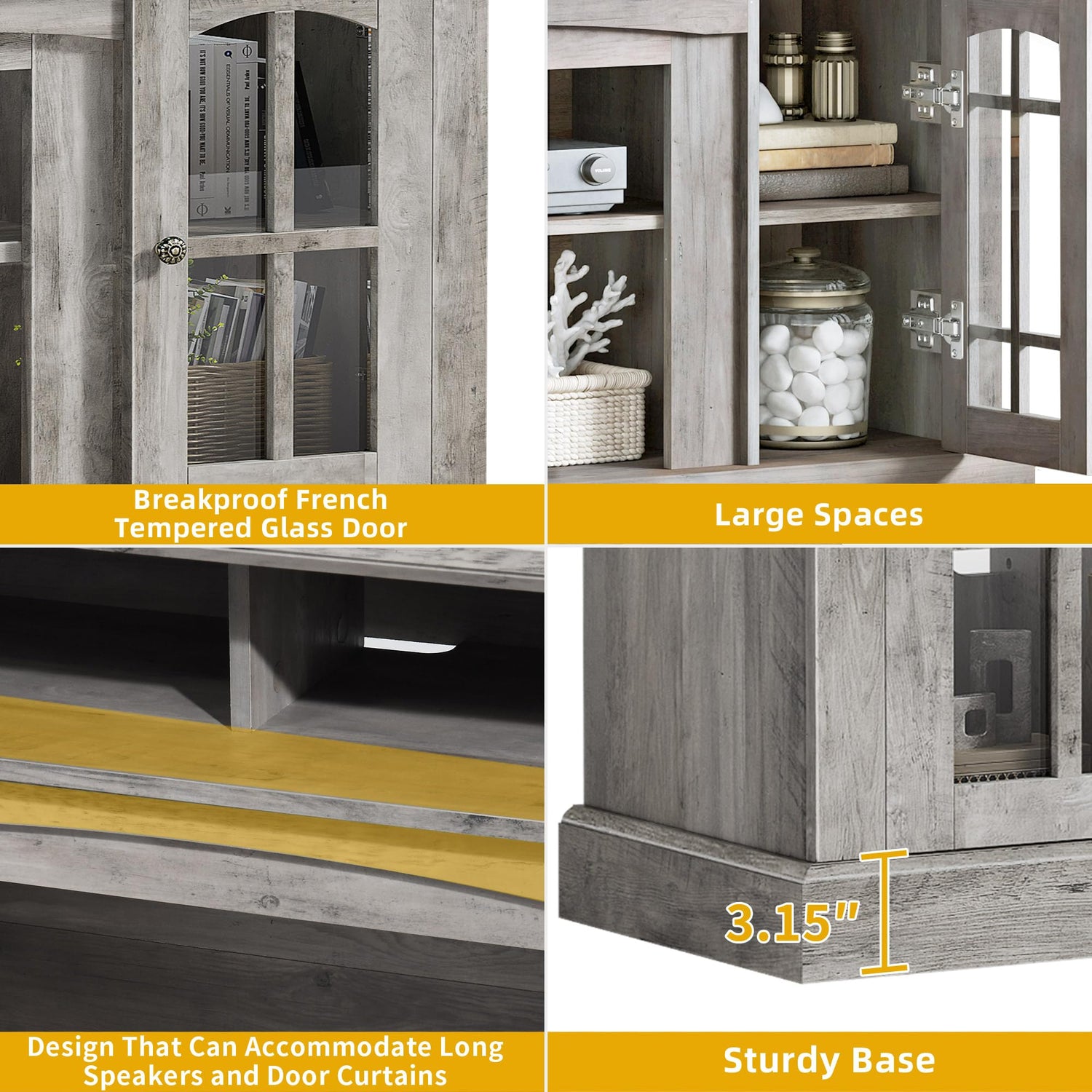 DWVO Farmhouse Television Stand for 75 Inch TV w/Outlets, LED Modern Entertainment Center with Glass Doors and Adjustable Storage Shelves, Media Console TV Cabinet for Living Room, Grey