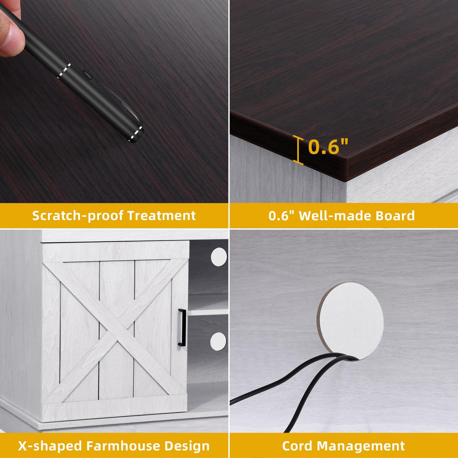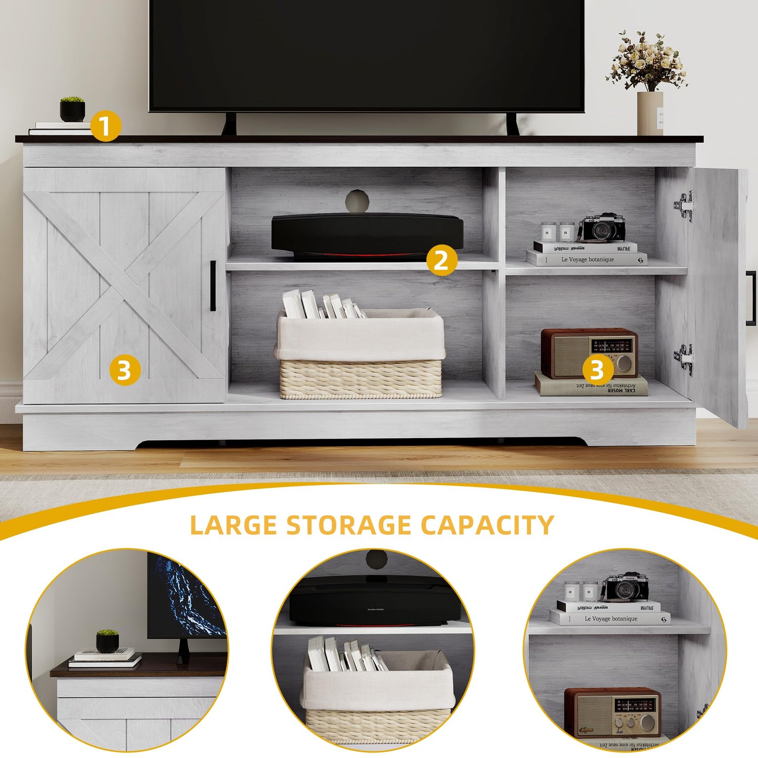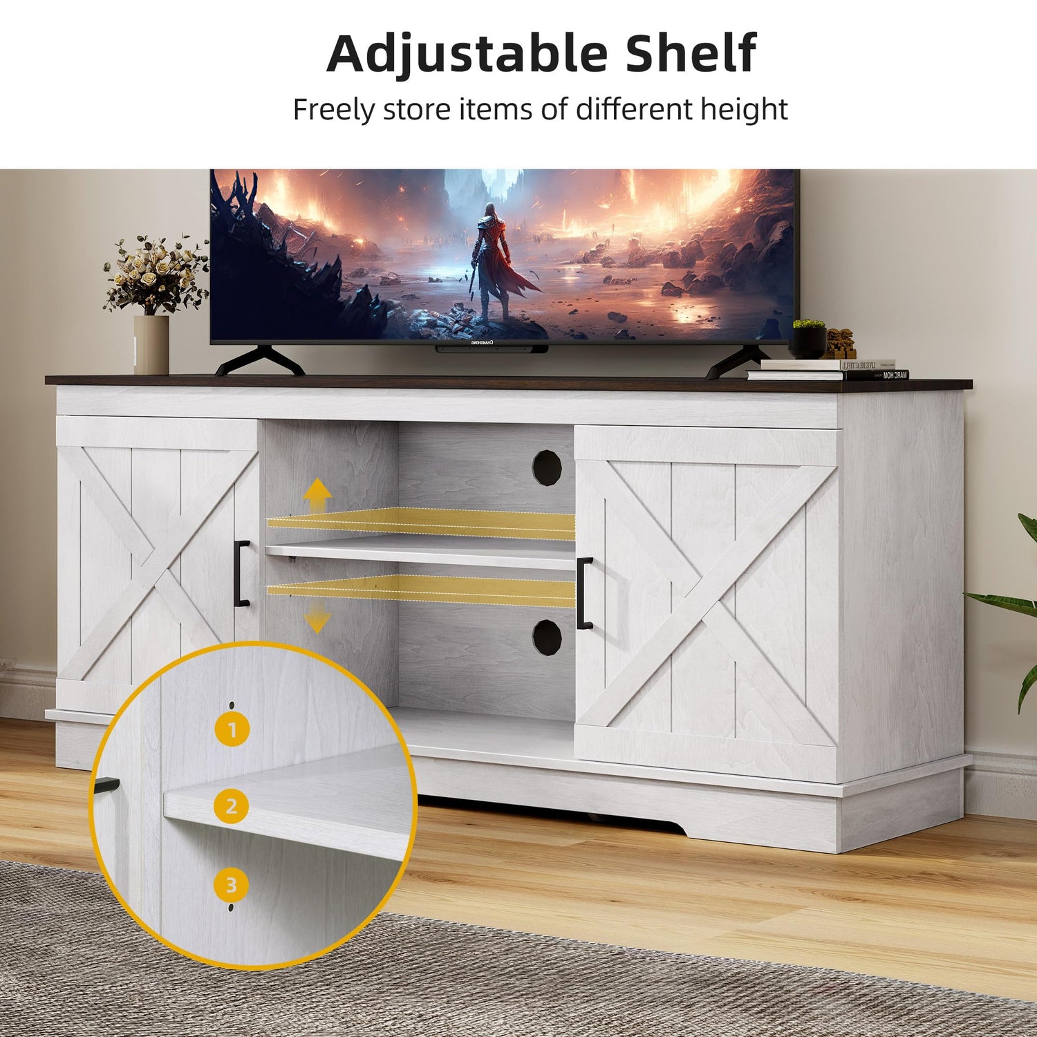 - Farmhouse TV Stand: With double barn doors featuring X elements and a chic blend of elegant grey white & espresso, the DWVO TV console embodies farmhouse charm, doubling as both a decorative piece and a practical storage cabinet