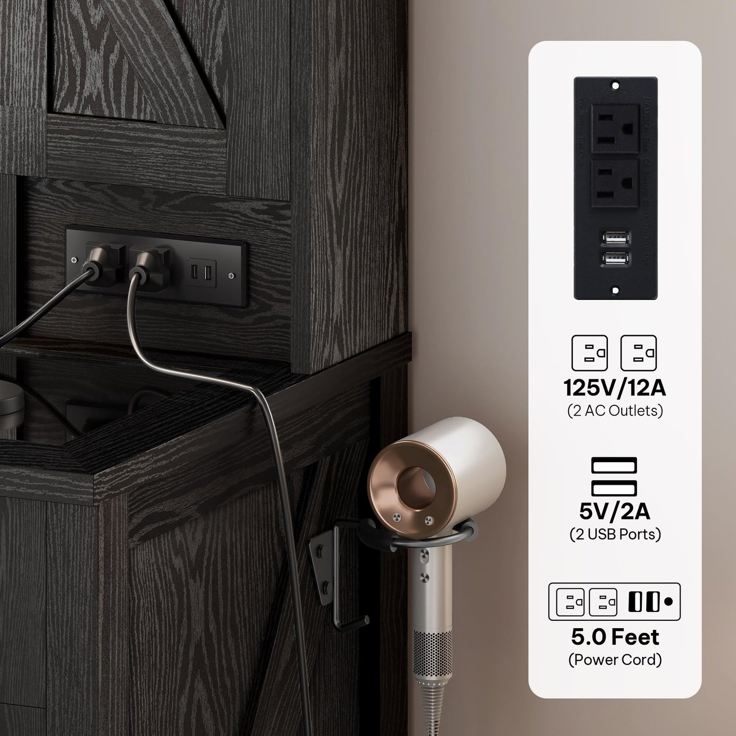 - Power Strip with Hairdryer Holder: Tired of few outlets? Our vanity table boasts 2 USB ports and 2 power outlets for charging your gadgets with ease. The hairdryer holder keeps your styling tools within arm's reach, making every day a good hair day