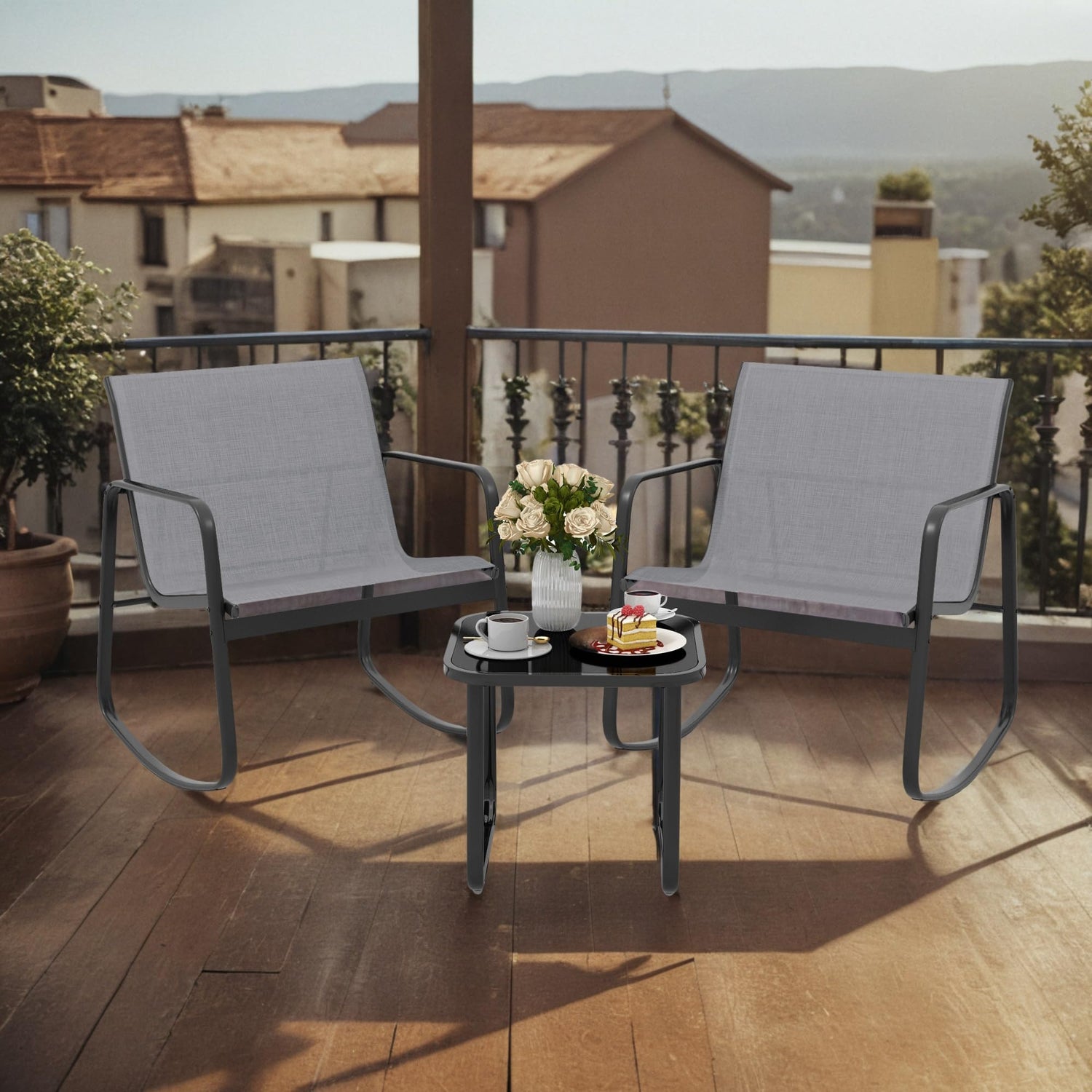 DWVO Gray 3-Piece Patio Bistro Set, Outdoor Textilene Furniture with 2 Rocking Chairs and Coffee Table for Backyard Lawn Garden Balcony Poolside