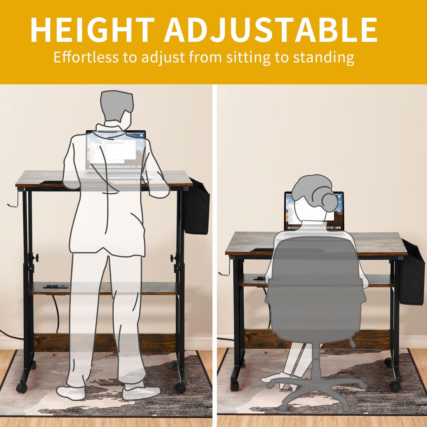 DWVO Height Adjustable Drawing Desk with Charging Station & Wheels, Rolling Craft Table with Tilting Top and Storage Bag, Small Standing & Sitting Laptop Computer Desk (Brown)