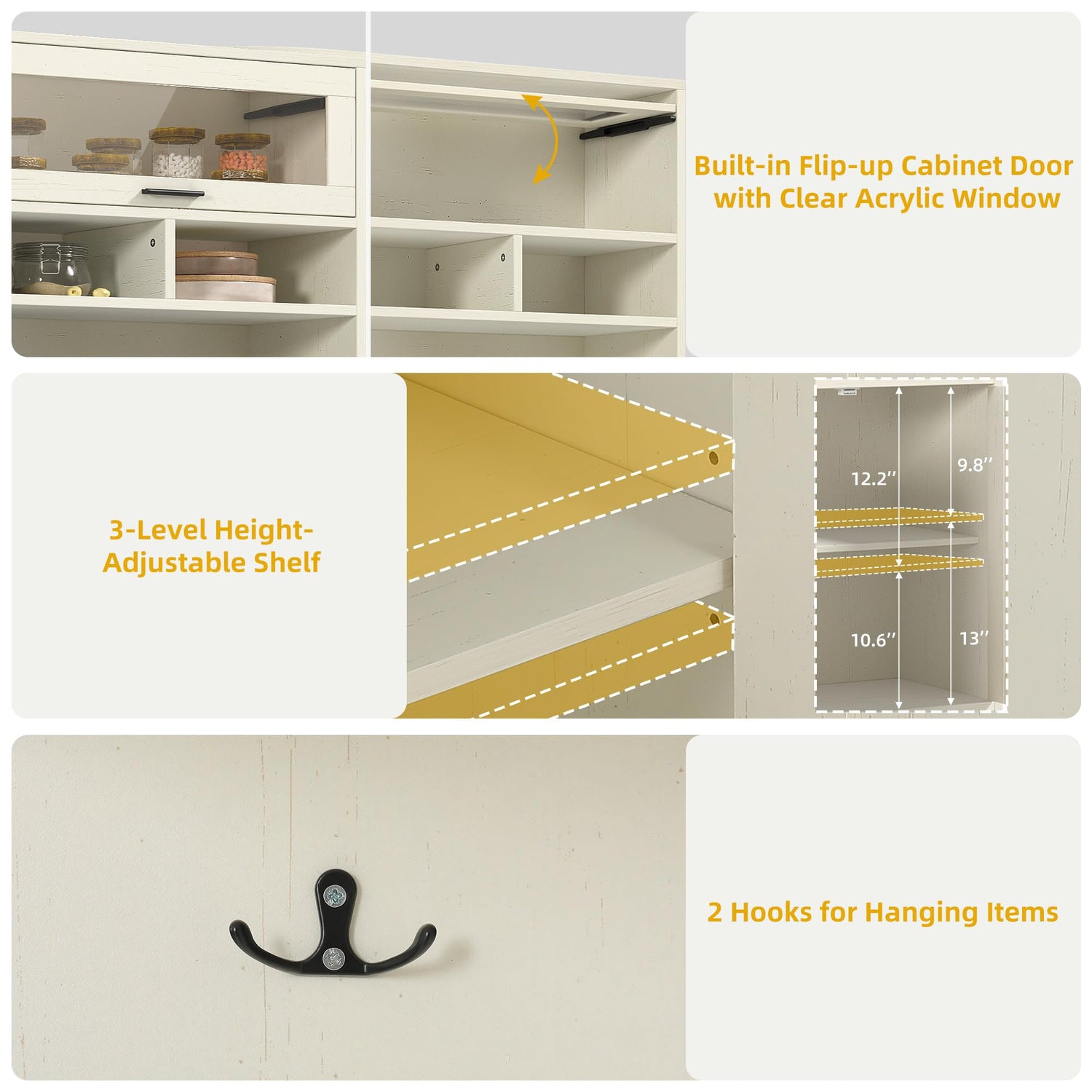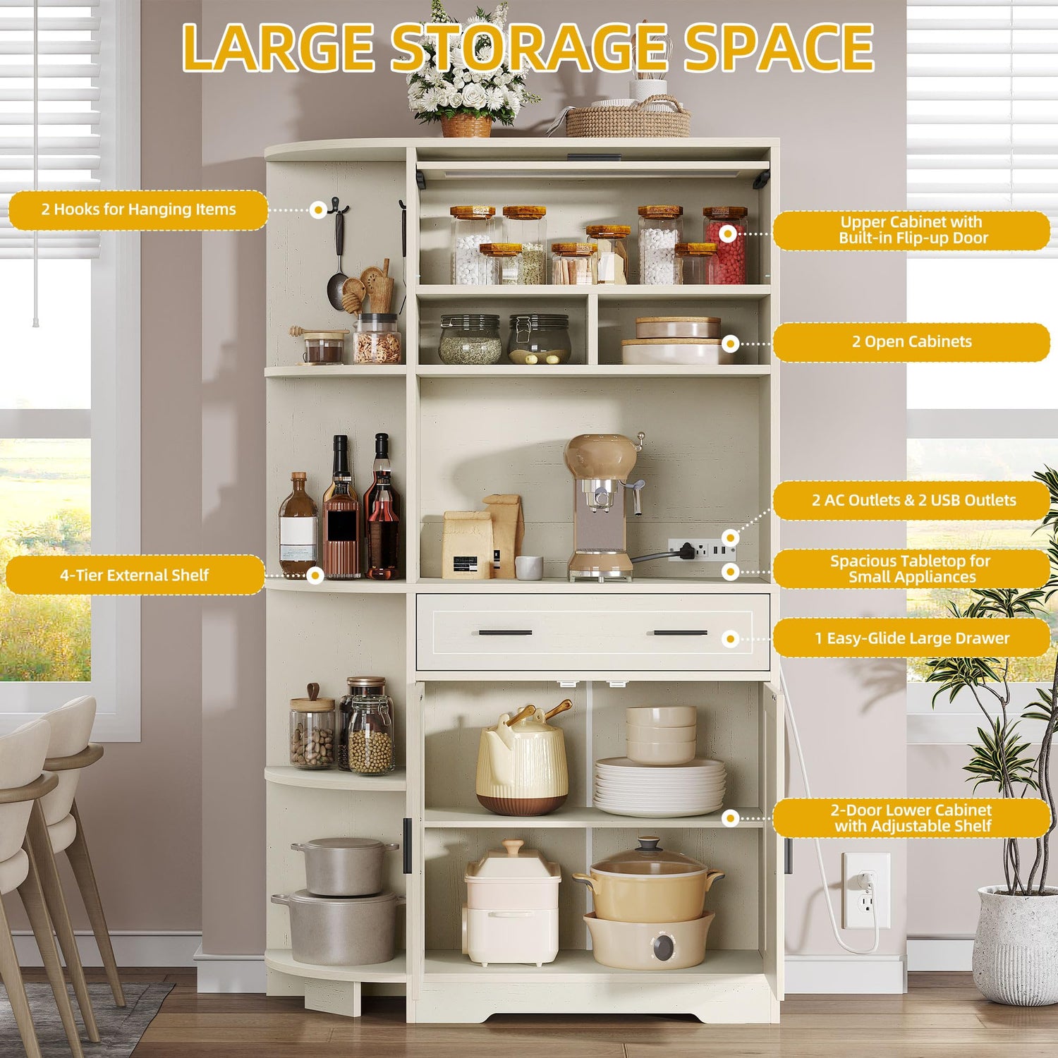 - Large Storage Space: Featuring 1 spacious compartment, 2 open cabinets, a 4-tier external shelf, 1 upper flip-up door cabinet, a 2-door lower cabinet with adjustable shelf, and an easy-glide drawer, this kitchen pantry cabinet offers both open areas and hidden spaces to organize small appliances and kitchenware & essentials well