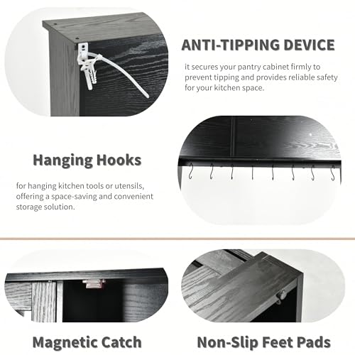 - Practical Power Outlets : Pantry storage cabinet equipped with practical power outlets, including 2 USB ports and 2 3-hole sockets. Easily charge your phone, tablet, or e-reader while using appliances like coffee makers, toasters, or microwaves. This storage cabinet with outlet ensures convenience and functionality in your kitchen.