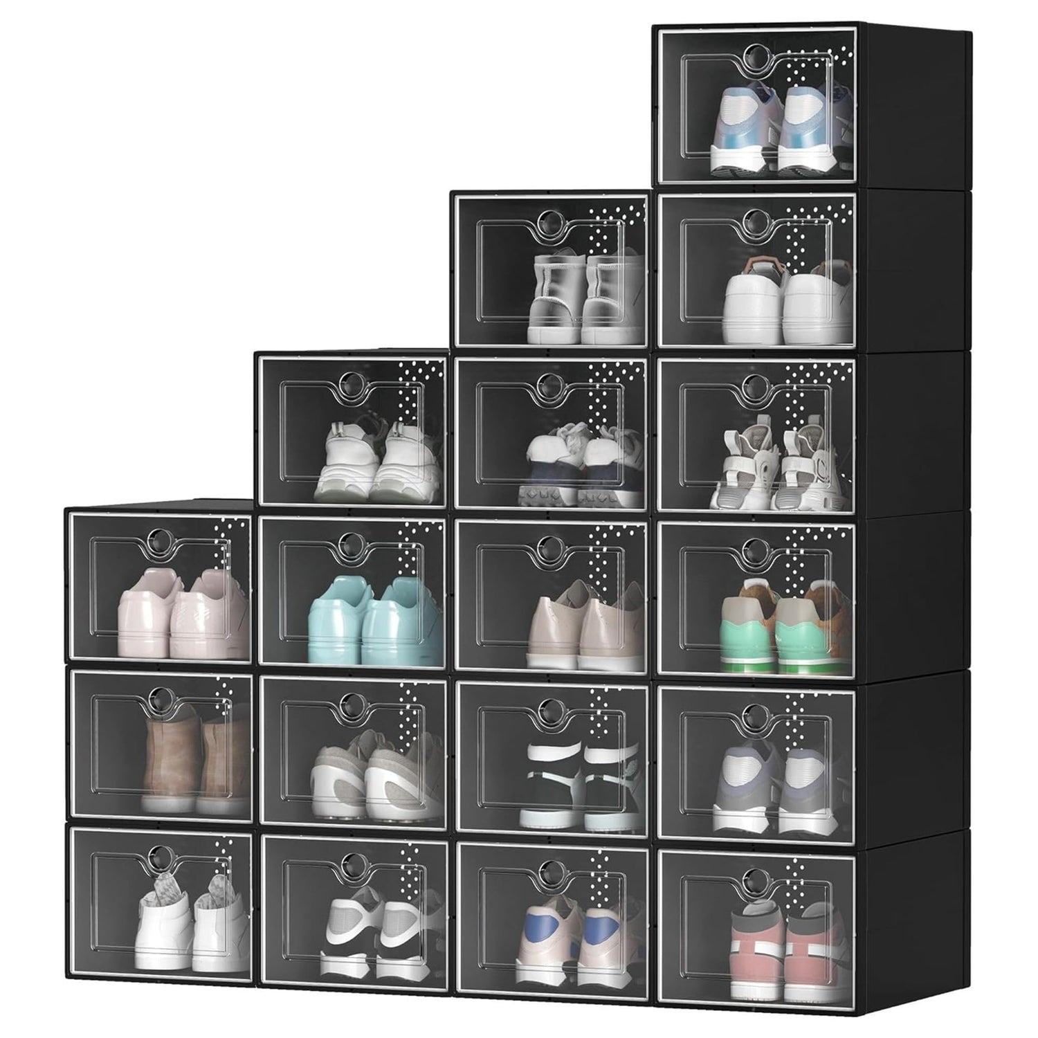 DWVO Large 18 Pack Shoe Storage Boxes, Plastic Stackable Shoe Storage Organizer for Closet, Fit up to US Size 13, Foldable Shoe Rack Clear Sneaker Containers (Black, Large)