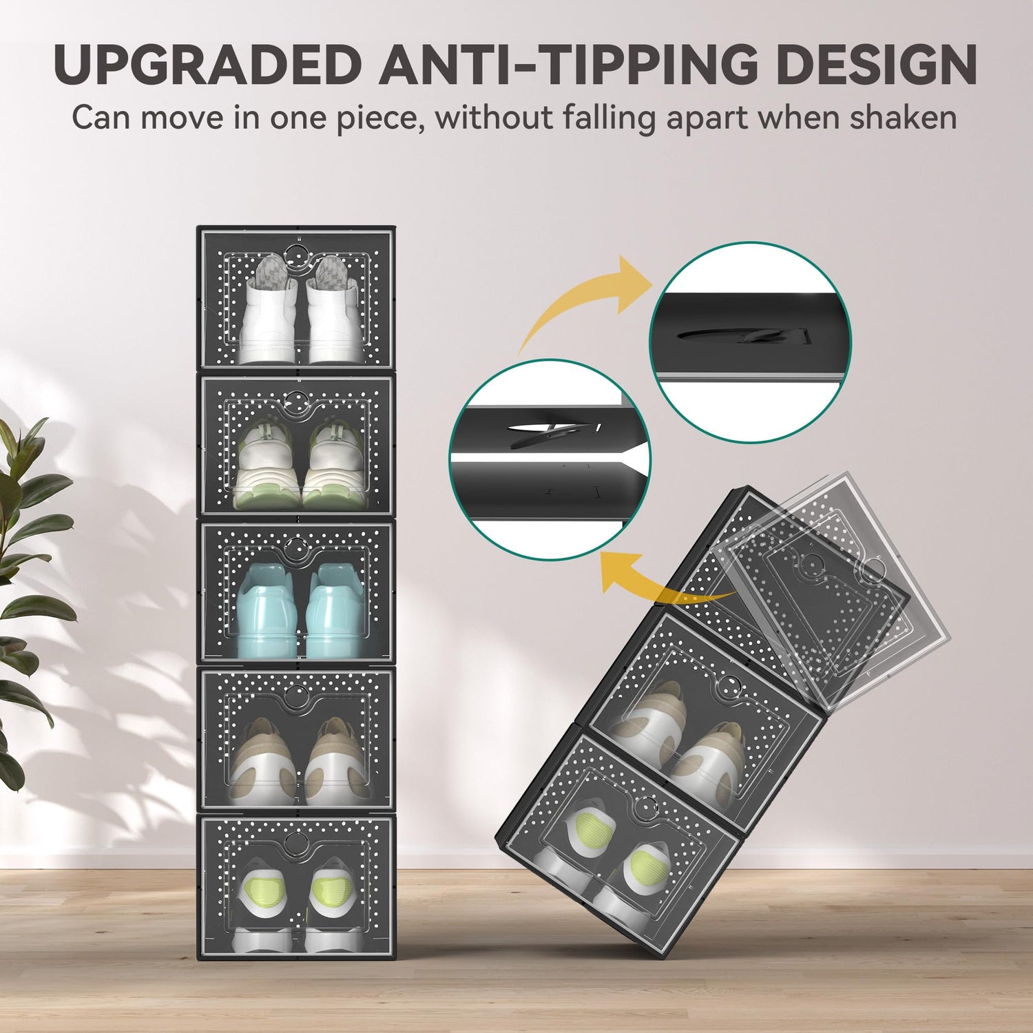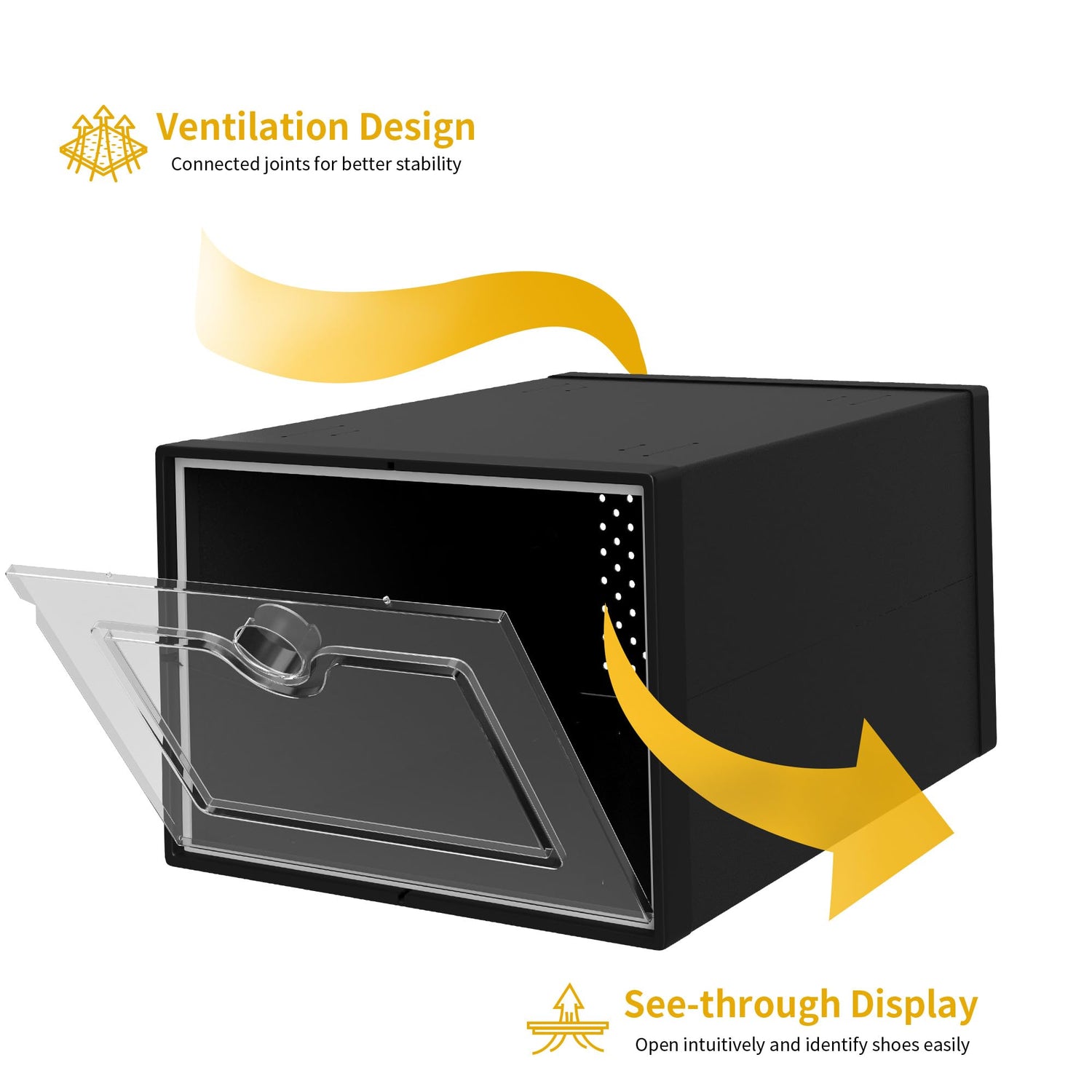 - Upgrade Construction: The shoe box body is made of 0.62mm ABS plastic material and fromt doors feature PP resin panels for sturdiness and durability.Keep a set of stackable shoe boxes in your house to keep your area neat & organized.