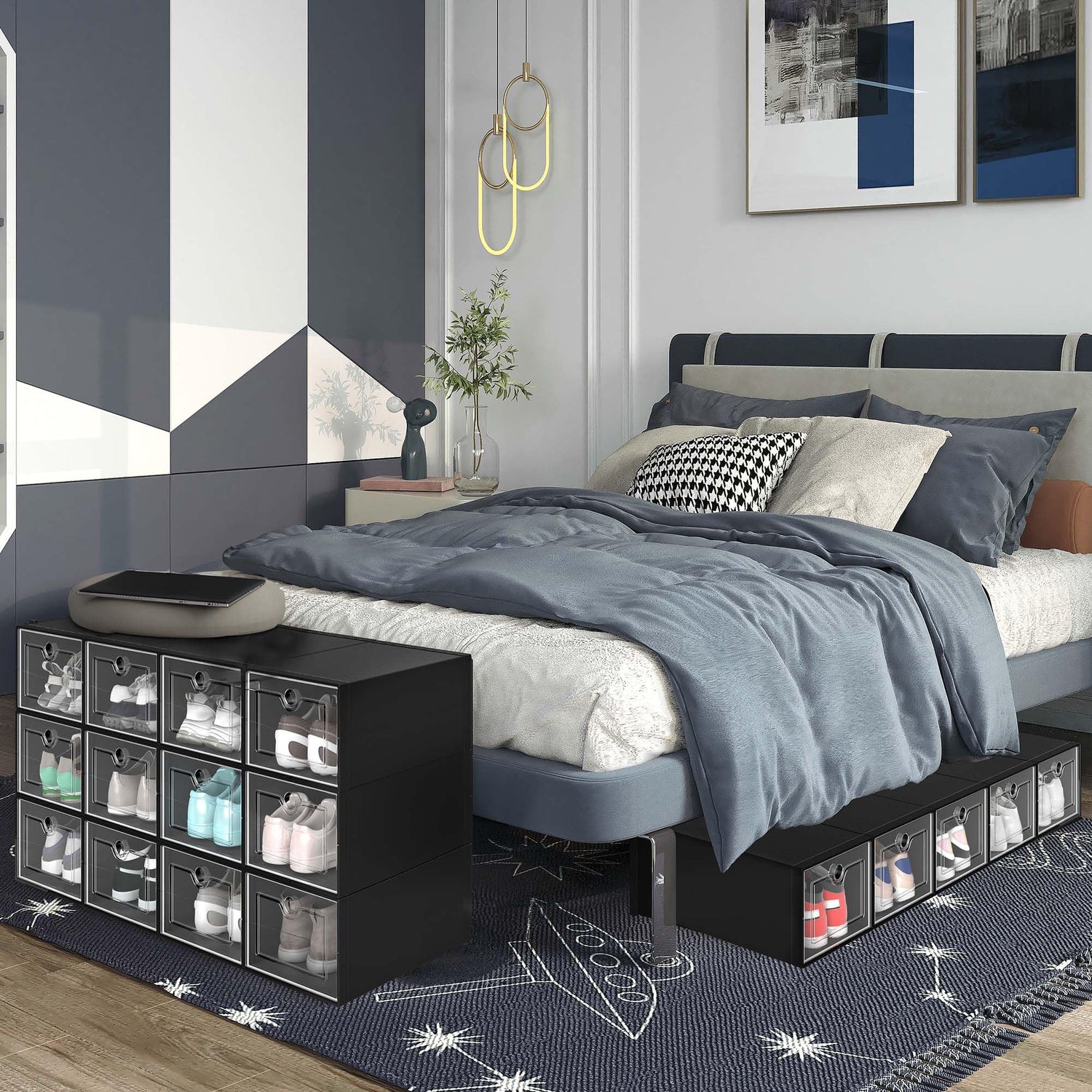 - Set of 18 Shoe Boxes: The package comes with 18 pack shoe boxes for storage. Each shoe box features dimensions of 13.8"L x 9.8"W x 7.3"H; Fits for different shoes up to US Men's size 12 and US Women's size 13. Flats, sneakers, flip flops, sandals, heels are suitable for storage.