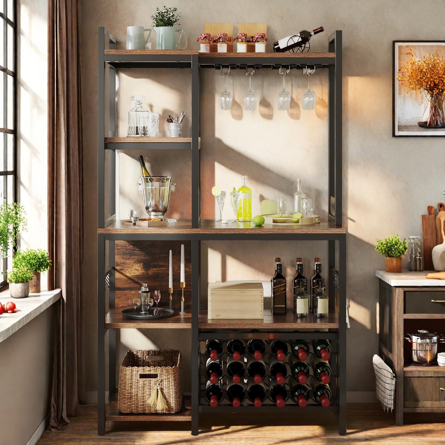 • Farmhouse Bakers Rack with Wine Rack: Multifunctional farmhouse bakers rack with wine rack. Great as a liquor cabinet, microwave stand, coffee bar, or display shelf. Rustic brown finish suits any décor
