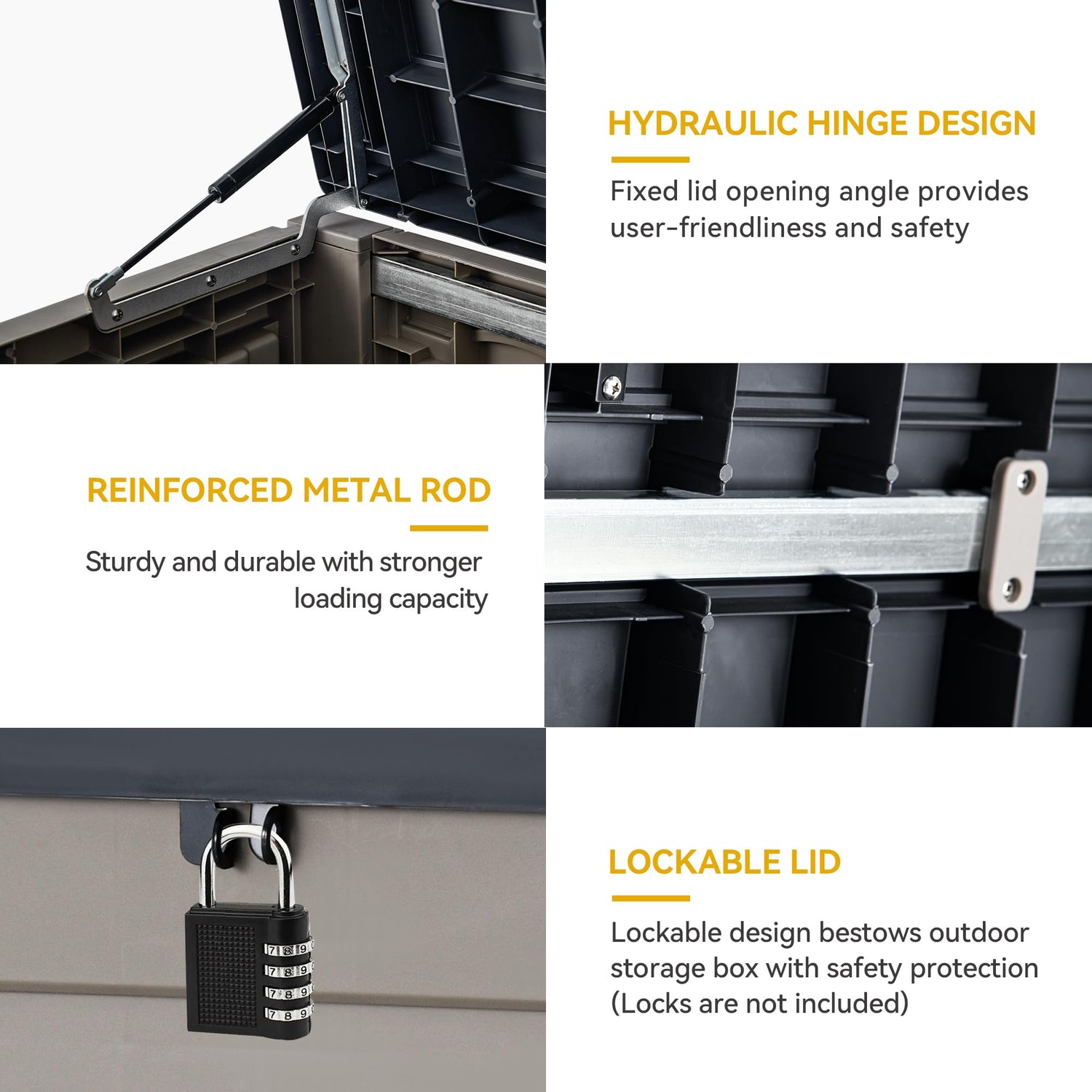 - Hydraulic Piston: The outdoor storage deck box features a hydraulic piston that can gently lift and close the top with minimal force to to prevent finger injuries; There are no user age restrictions