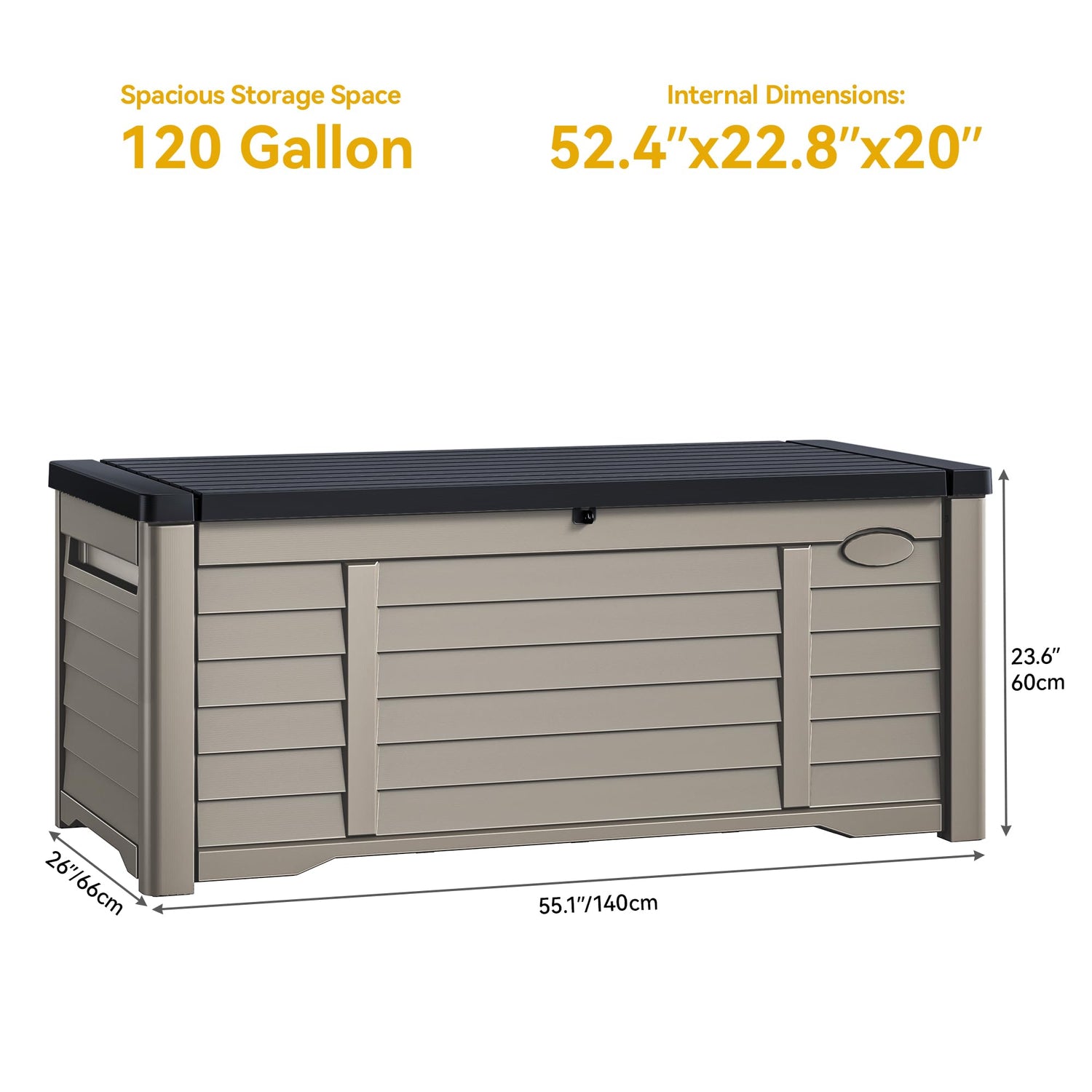 - Ideal Outdoor Storage Box: This outdoor storage box features a total capacity of 120 gallons; It has external dimensions of 55.12" L x 26.3" W x 23.6" H and internal dimensions of 52.2" L x 22.67" W x 19.96" H; The box cover can be locked to ensure privacy and security (lock not included)