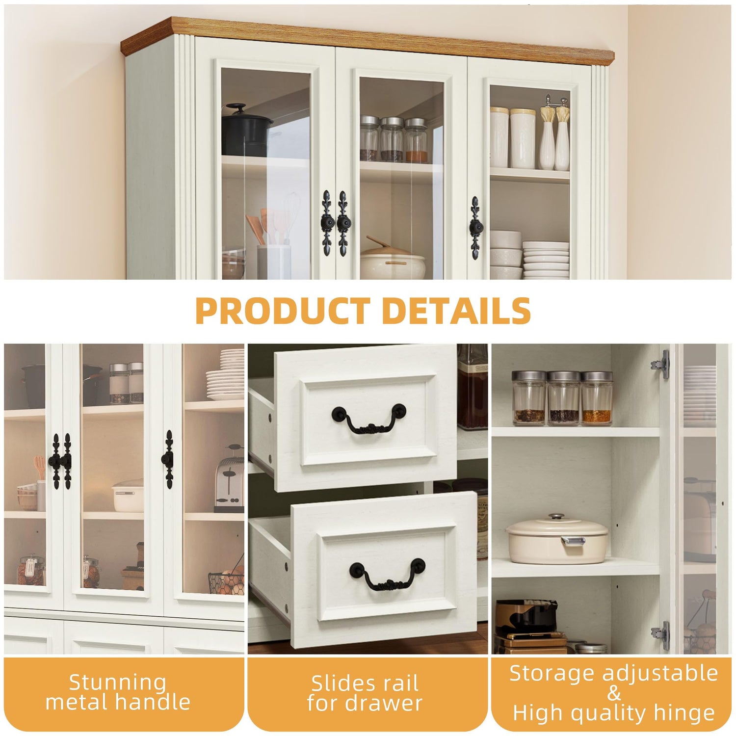 DWVO Large Storage Cabinet, 72" Tall Kitchen Pantry with Glass Doors, Freestanding Glass Display Cabinets with Adjustable Shelves & Drawers, Food China Hutch for Dining Room, Living Room, White