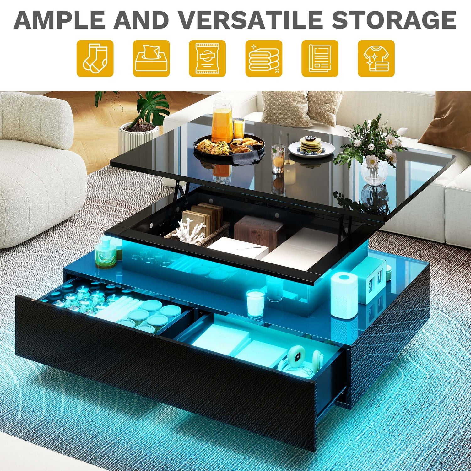 - Color Your World: Light up your life with built-in RGB LED lights of our black coffee table! Control colors and brightness remotely to set the ideal mood for relaxing, partying, or chatting. Your ambiance, your way