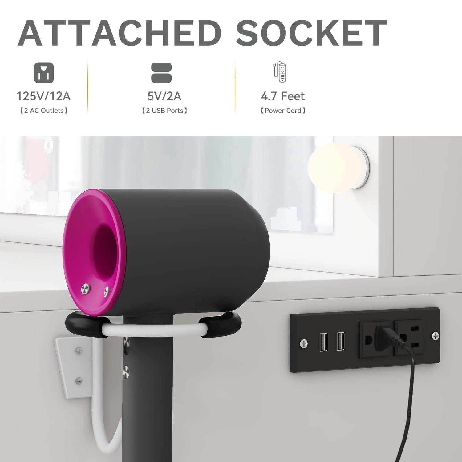 - Stay Powered While You Prep: No need to search for outlets; This vanity table comes with 2 AC sockets, 1 USB, and 1 Type-C port; A built-in hair dryer holder keeps tools ready, while the soft cushioned stool makes getting ready effortless