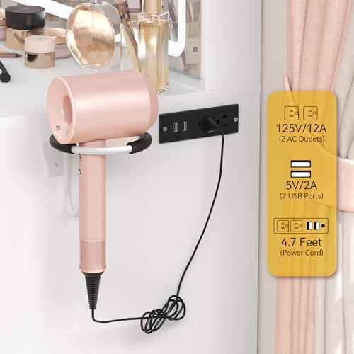 - Built-in Charging Station and Hair Dryer Rack: A multi-functional makeup desk that combines 2 standard plug sockets, 2 USB ports, and 1 hair dryer rack so your hair dryer, mobile phone, and curling iron can be within arm’s reach; Glam makeup vanity for dressing room, bedroom, salon, or live broadcast