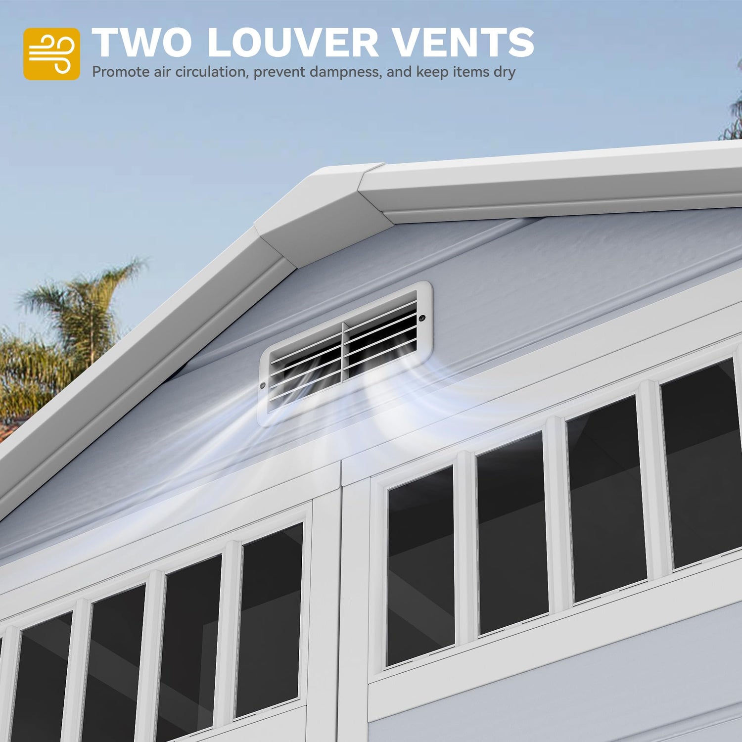 - Well-Designed Plastic Storage Shed: Each fence-style window measures 23.2"W x 11.4"H, while the side lattice-style window is 15.1"W x 24.6"H. Additionally, it features 2 louver vents for enhanced sunlight and ventilation