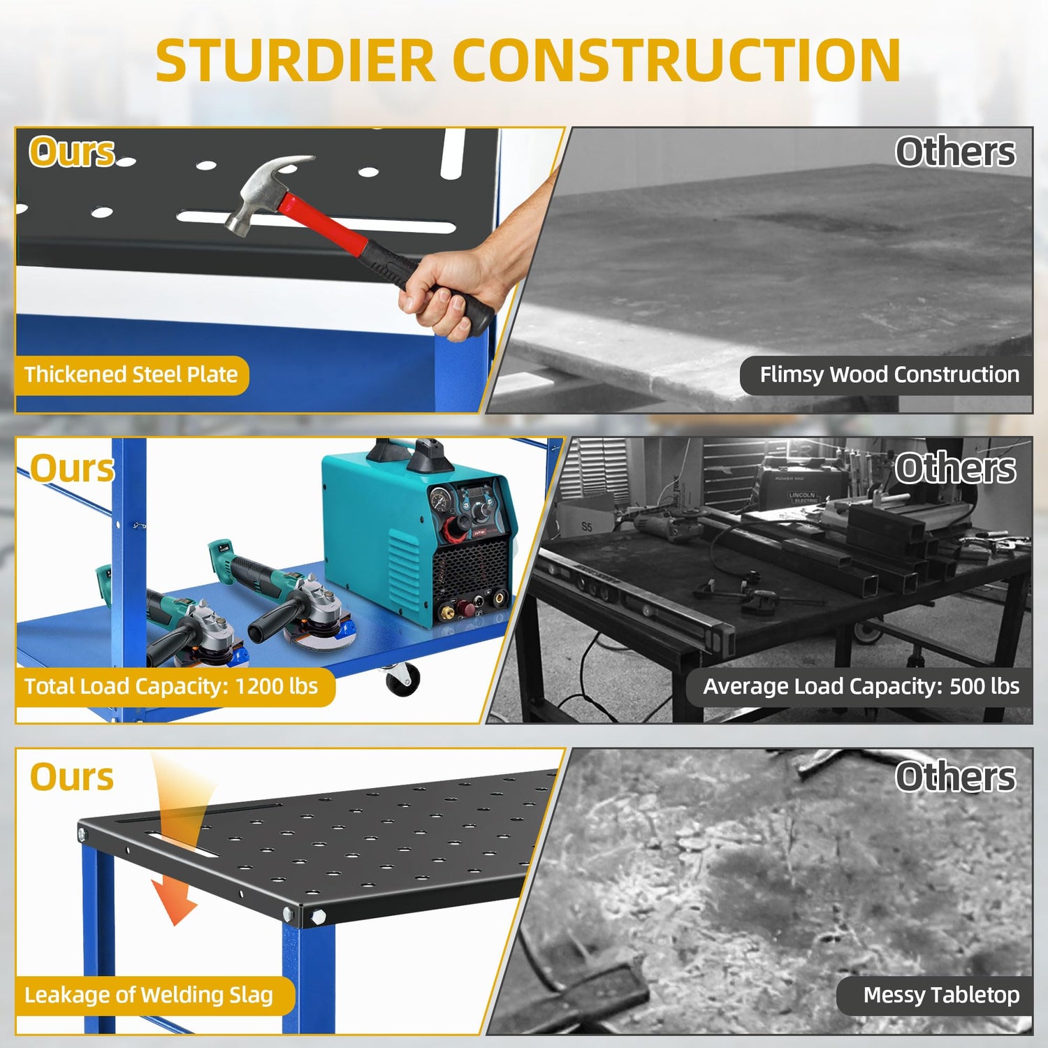 - High Load Capacity: Designed to handle heavy workloads, this metal welding bench has a load capacity of 1200lbs, ensuring stability and durability for a wide range of welding applications.