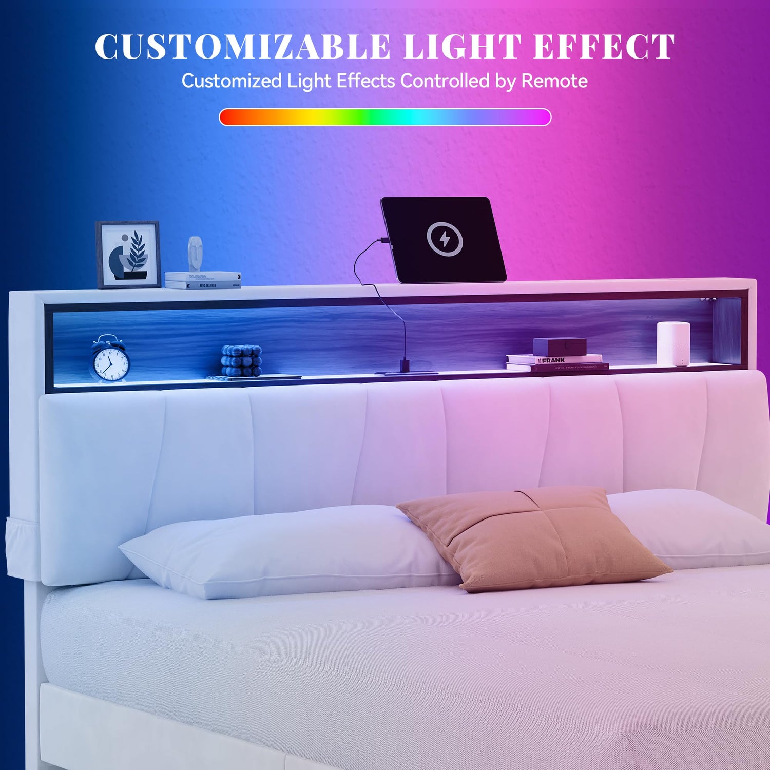 DWVO Queen Size Bed Frame with Storage, LED Headboard, Platform Bed with Outlet & USB Ports, No Box Spring Needed, Easy Assembly (Beige)