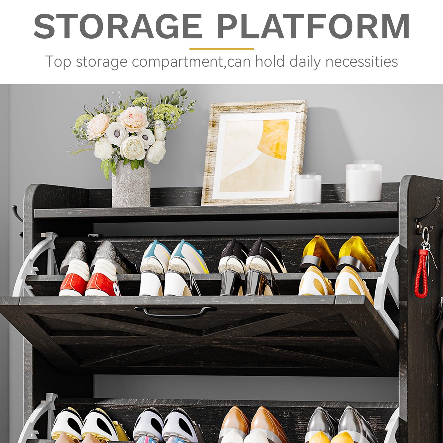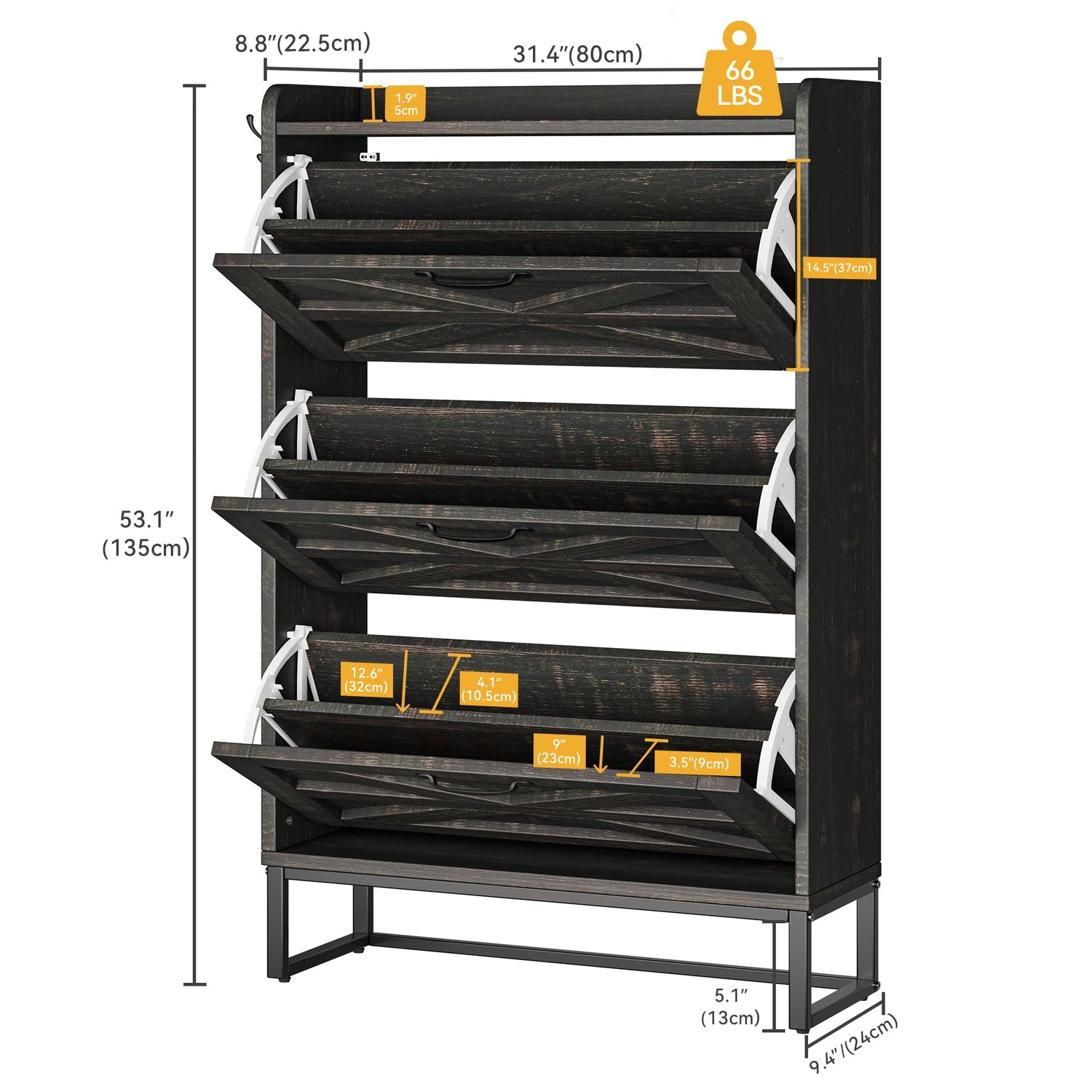 - Farmhouse Shoe Stroage Cabinet: Featuring 3 flip-down drawers with dual-layer storage compartments, the shoe cabinet accommodates many pairs of shoes. And the adjustable shelves can be taken down for large sizes of shoes