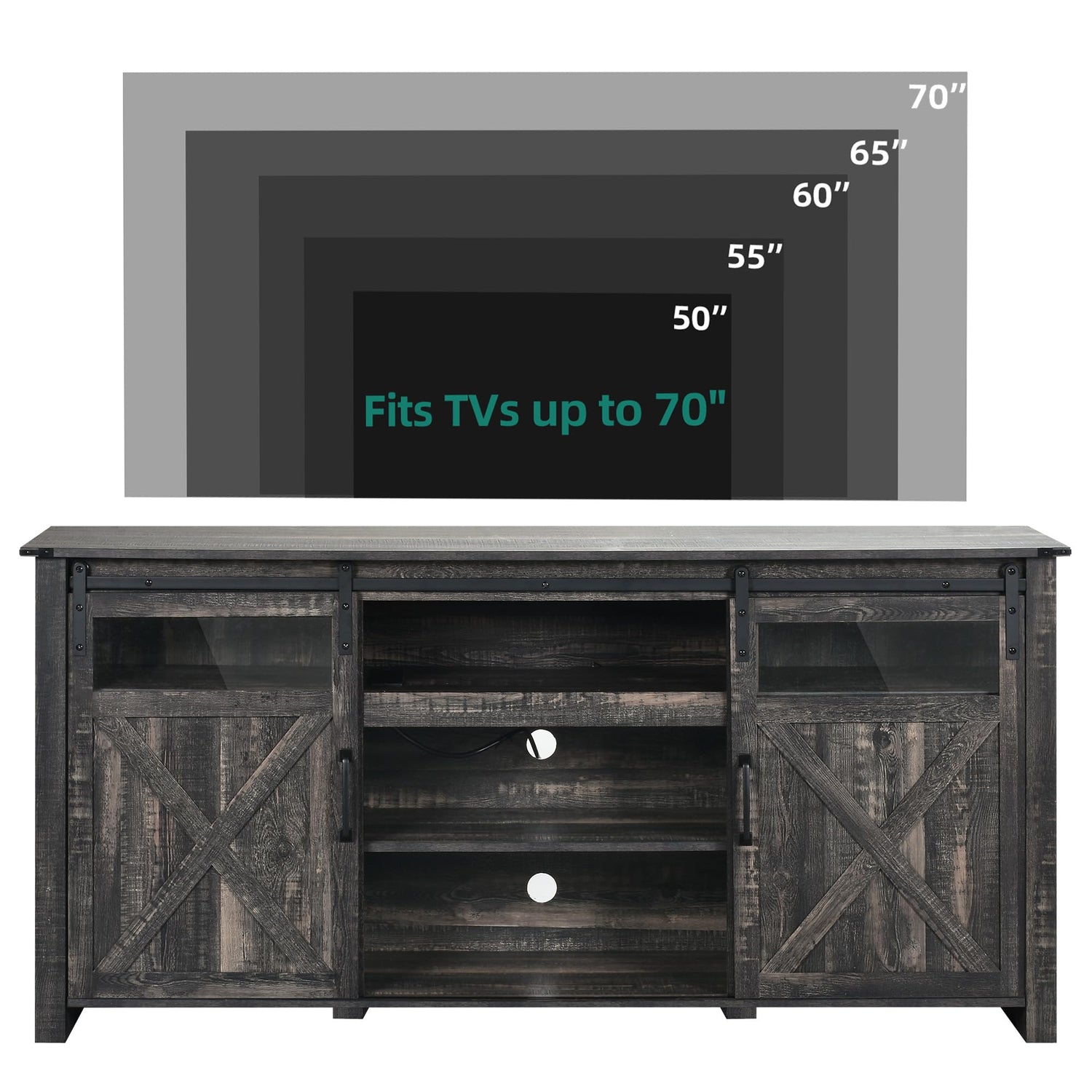 Details: DWVO TV Stand for 75 Inch TV with Power Outlets, Farmhouse Entertainment Center with Sliding Barn Doors and Adjustable Shelves, TV Cabinet Media Console Table for Living Room, Dark Rustic Oak