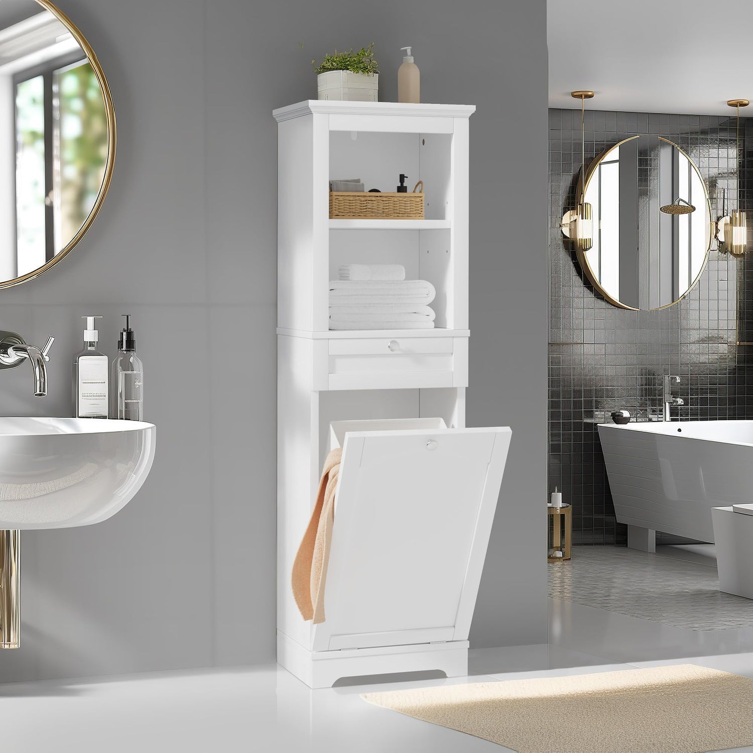 - Versatile Storage: Expand your storage options with this tilt out laundry hamper featuring two open compartments and a convenient drawer. Ideal for bathrooms, laundry rooms, and beyond, it offers a flexible solution to keep your space organized.
