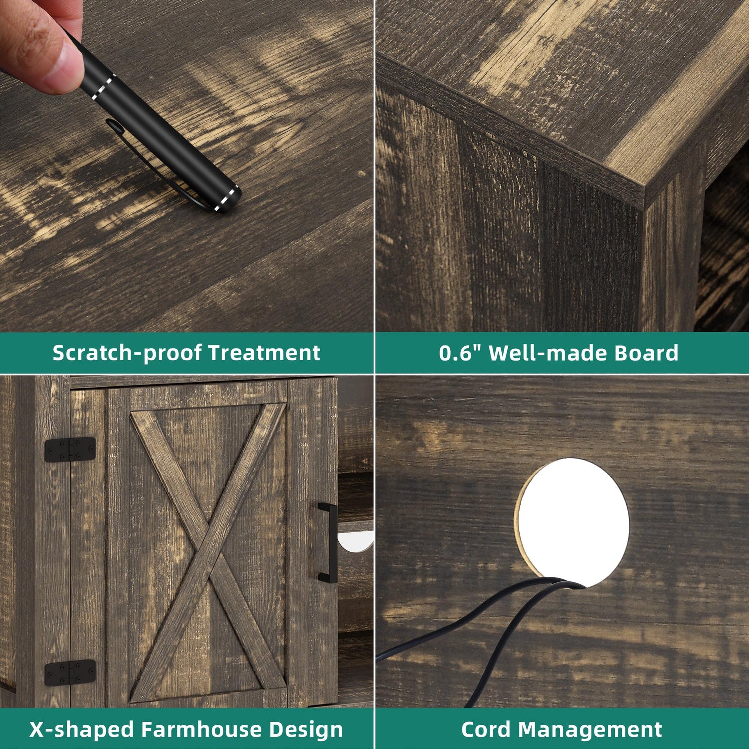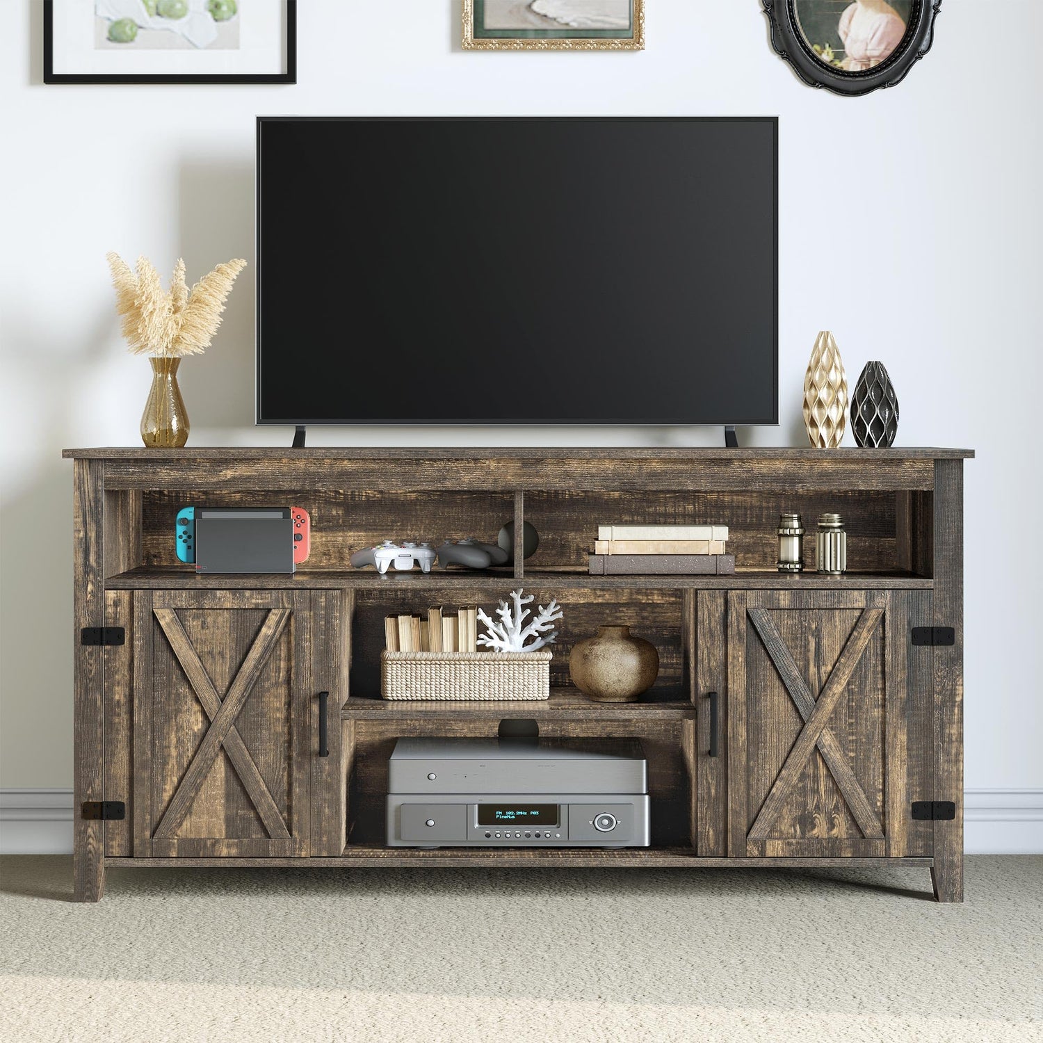 - Farmhouse TV stand: Has two farmhouse barn doors on the Rustic TV stand, it's appearance adopts an X-shaped design paired with exquisite wood grain, adding a rich farmhouse style to your living space