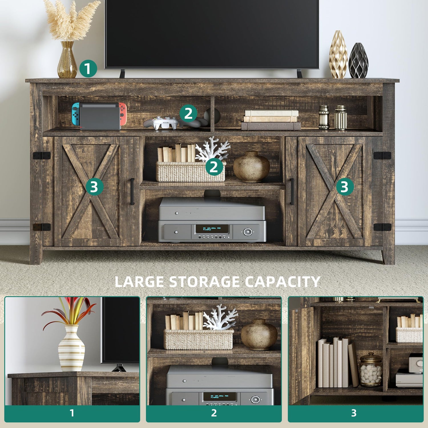 - TV Stand with Storage: This tv stands for living room come with 2 cabinets of storage space inside the barn doors, 1 adjustable or removable shelf, 1 open storage shelf, and one 59 inch large spacious desktop. It providing abundant storage or display space for CDs, DVDs, game boxes, decorative items and more. The spacious tabletop supports 40, 45, 50, 55, 60, or 65 inch TV