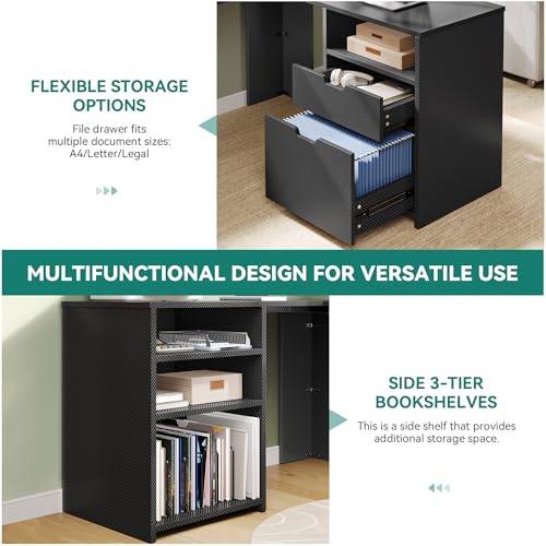 - Ample Workspace & Storage: Enjoy ample working space with 3 wide desktops, complete with a monitor stand for better sitting posture. Plus, keep your A4, letter, legal size files, office essentials, magazine and record organized with 1 file drawer, 1 box drawer and 3 open storage shelves, while the record storage display shelf for albums, DVD,books and file folder,keeping them organized and upright for easy access
