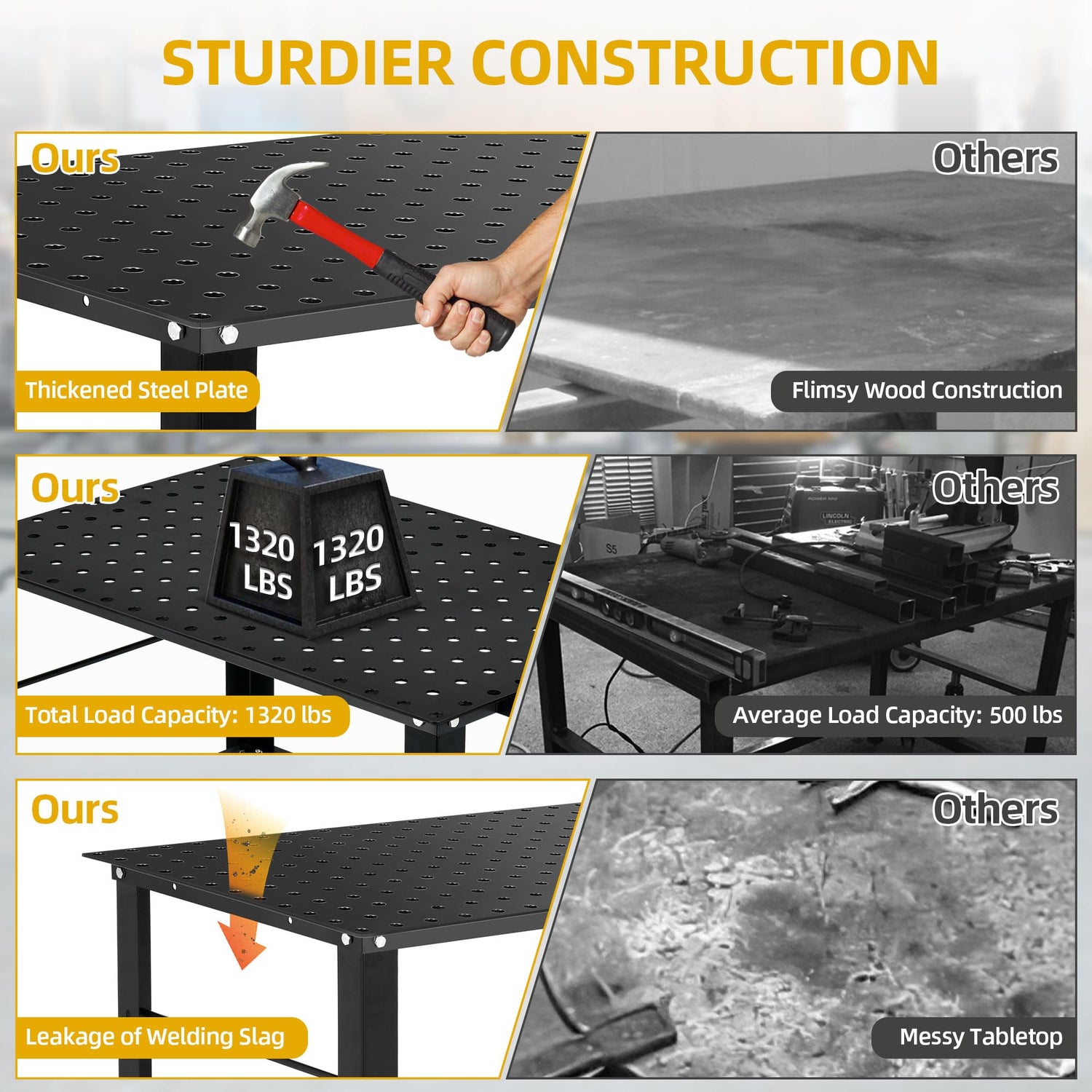 • High Load Capacity: Designed to support heavy workloads, this welding table has a remarkable 1320lb load capacity, making it ideal for handling large and demanding fabrication projects with ease.
