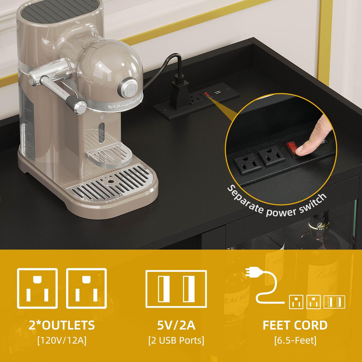 - Coffee Bar Cabinet with Built-In Outlets: Our home bar cabinet comes with a power strip, featuring 2 outlets and 2 USB ports, allowing you to easily charge your coffee machine, bar accessories, illuminated decorations, and other devices without the need to search for separate power sources.