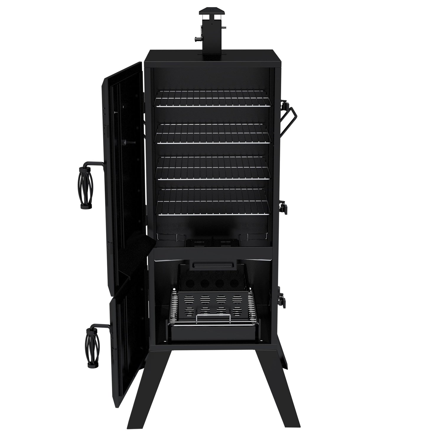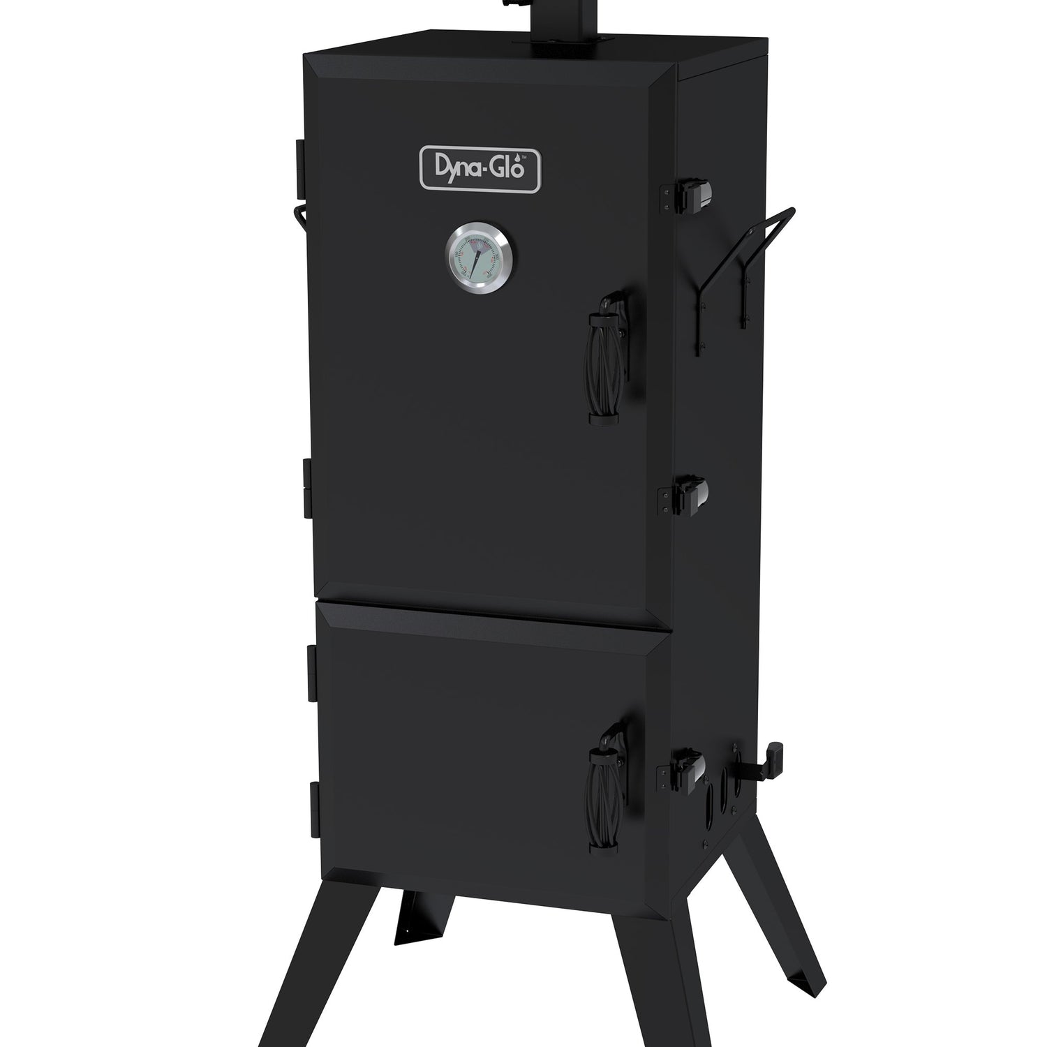 Details: Charcoal enthusiasts, take heart! With this Dyna-Glo vertical smoker, you can now smoke your favorite foods with your favorite wood chips AND your favorite fuel source, charcoal! Vertical smokers are ideal for capturing maximum smoke flavor, so we've included 4 height-adjustable cooking grates, with a total of 784 square inches of cooking space, to accommodate different sizes and types of food. The double door design helps minimize heat loss when access to the food or fuel is needed. The porcelain enameled charcoal chamber is designed to keep briquettes stacked tightly for improved burn efficiency and the removable steel ash pan is designed to handle large amounts of ash for hours of maintenance free cooking.
