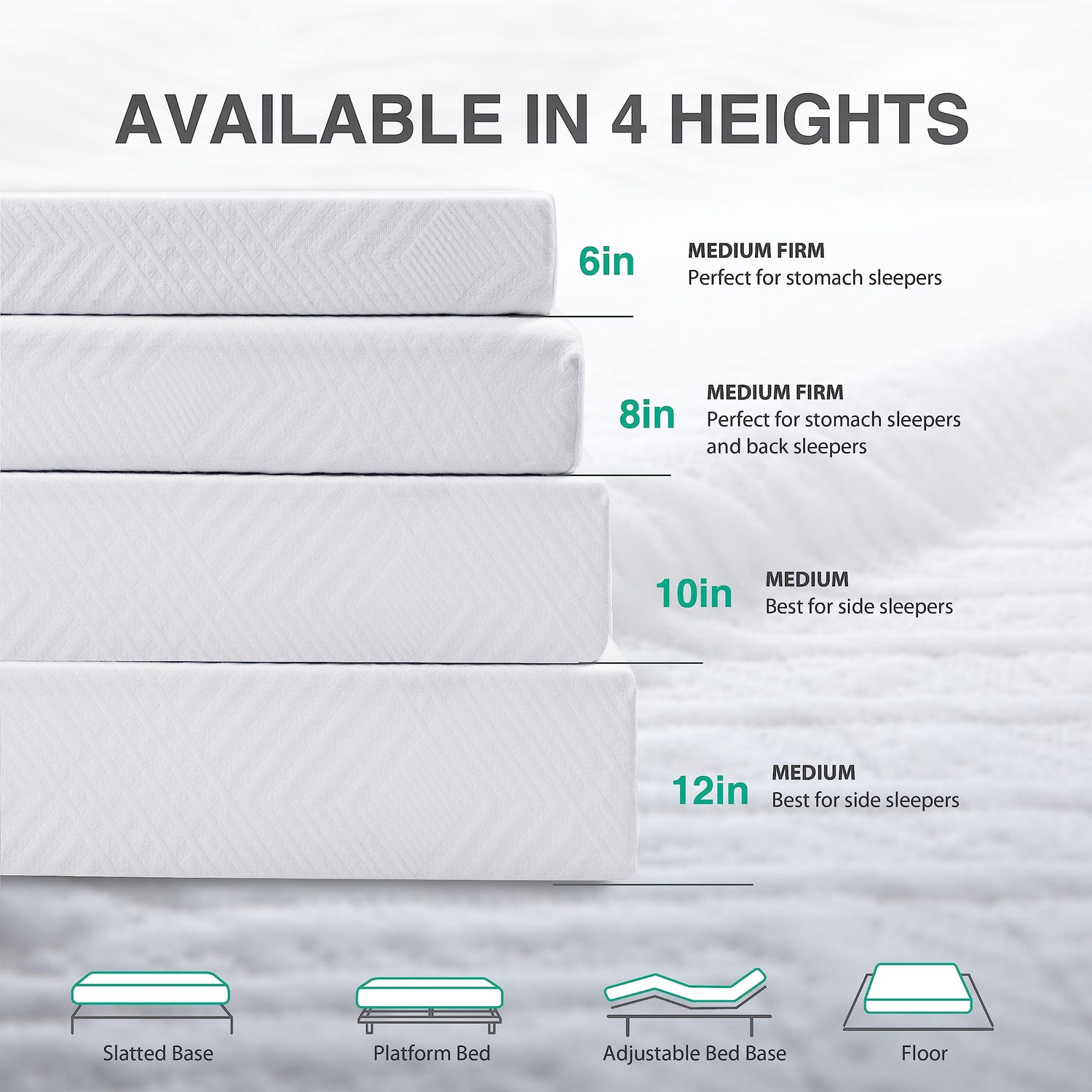 - 【Easy Setup】Our mattresses can fit all types of frames, including box springs, floors, adjustable beds, foundations, slatted platforms, flat platforms, and hospital beds. Simply wait for 2 hours for the mattress to fully expand to its original shape.
