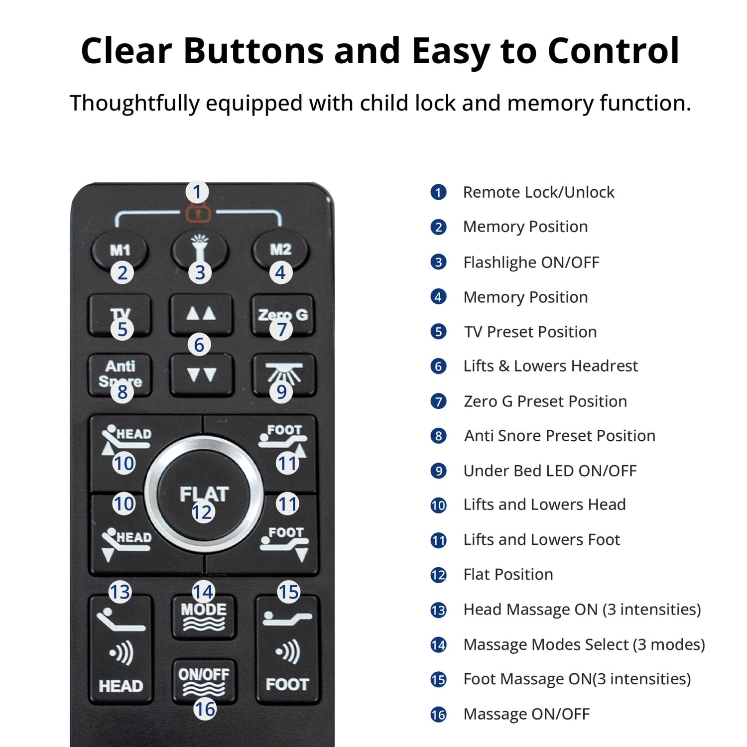 - 【Adjustable Bed Frame with Mattress】 You can adjust the bed to the best position(Head 0-57°,Foot 0-38°). Upgraded Zero Clearance Mechanical Design allows the adjustable bed frames to be used without legs, making them compatible with any platform or flat ground. They will fit neatly inside existing headboards, footboards, and side rails.