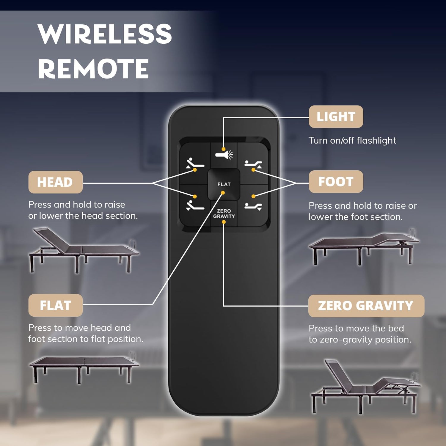 - 【Wireless Remote & Zero Gravity】This electric bed comes with a use-friendly wireless remote control that features a flashlight function.Adjust the angle of the head, foot to find the most comfortable position. It can also directly adjust to the zero gravity and flat position,the ZG position has a lot benefits such as pressure relief, reduced snoring, and enhanced sleep quality