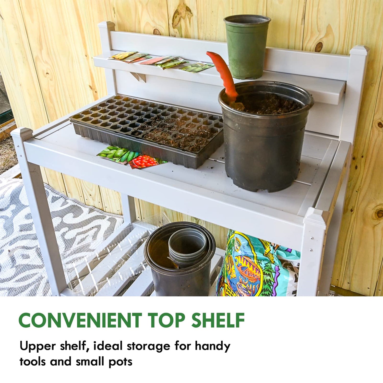• SPACIOUS WORKING AREA: The workstation table provides ample room for you to work. The spacious table top is perfect for planting seeds and repotting plants. The upper shelf can be used to store your seeds, small plants, fertilizers, and gardening supplies. Weight capacity of the table top is 110 lbs.
