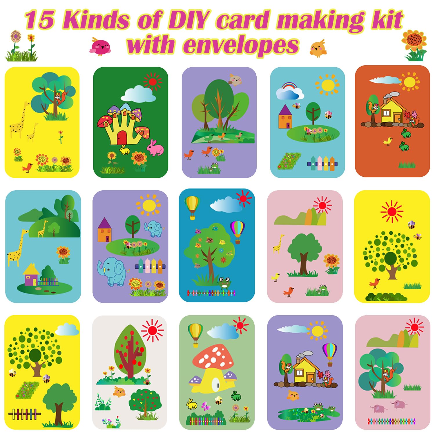 - Package - 15 sets card making kits in total, with 6 sheets stickers including 116 pieces small stickers, 15 pcs blank color cards and 15 pcs envelopes. These greeting card making kits are very interesting for kids to DIY, sufficient quantity accessories can meet your creative needs.